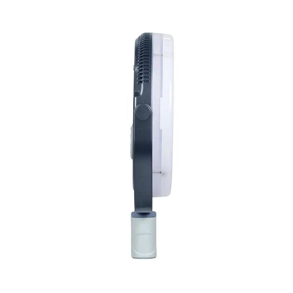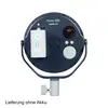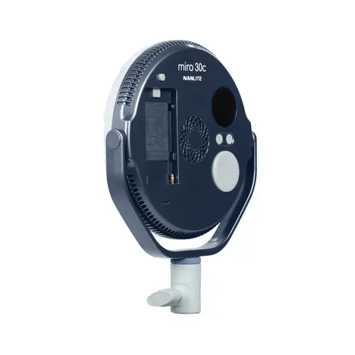 Rundes, flaches Kunststoffgehäuse mit 16,7 cm Durchmesser, mit Aufnahmefach für einen NP-F-Akku bzw. die optionale Powerbank-Halterung.