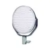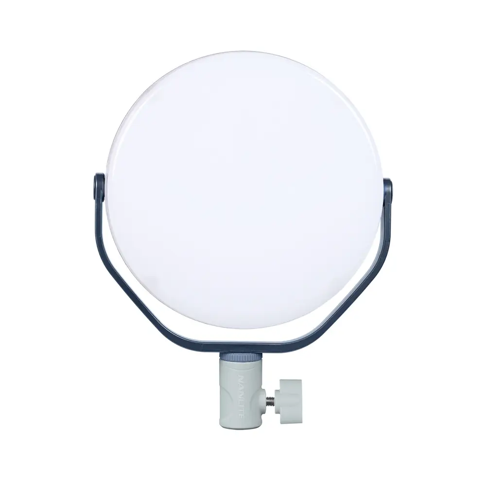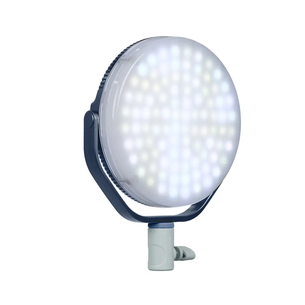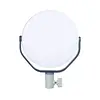 Runde, multifunktionale Full-Color-Flächenleuchte mit modernem Design, leicht und kompakt, mit flachem Kunststoffgehäuse und Montagebügel. Im Gegensatz zu typischen rechteckigen Flächenleuchten erzeugt die runde Form natürliche Lichtreflexe in den Augen für Porträts, Interviews und Social-Media-Aktivitäten.