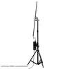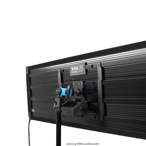 Leuchtenhalterung zur Befestigung der Leuchte auf Stativen und Halterungen mit 16 mm (5/8“)-Normzapfen/Baby-Pin. Mit zwei Kugelgelenken, die über eine einzige Flügelschraube fixiert werden, Befestigungsplatte, die über Schnellverriegelung an der Rückseite der Leuchte einrastet sowie Schwenk-/Tragegriff zum Ausrichten und Tragen der Leuchte. Eine weitere mitgelieferte Leuchtenhalterung besteht aus einer Befestigungsplatte mit 16 mm (5/8“)-Normzapfen/Baby-Pin.