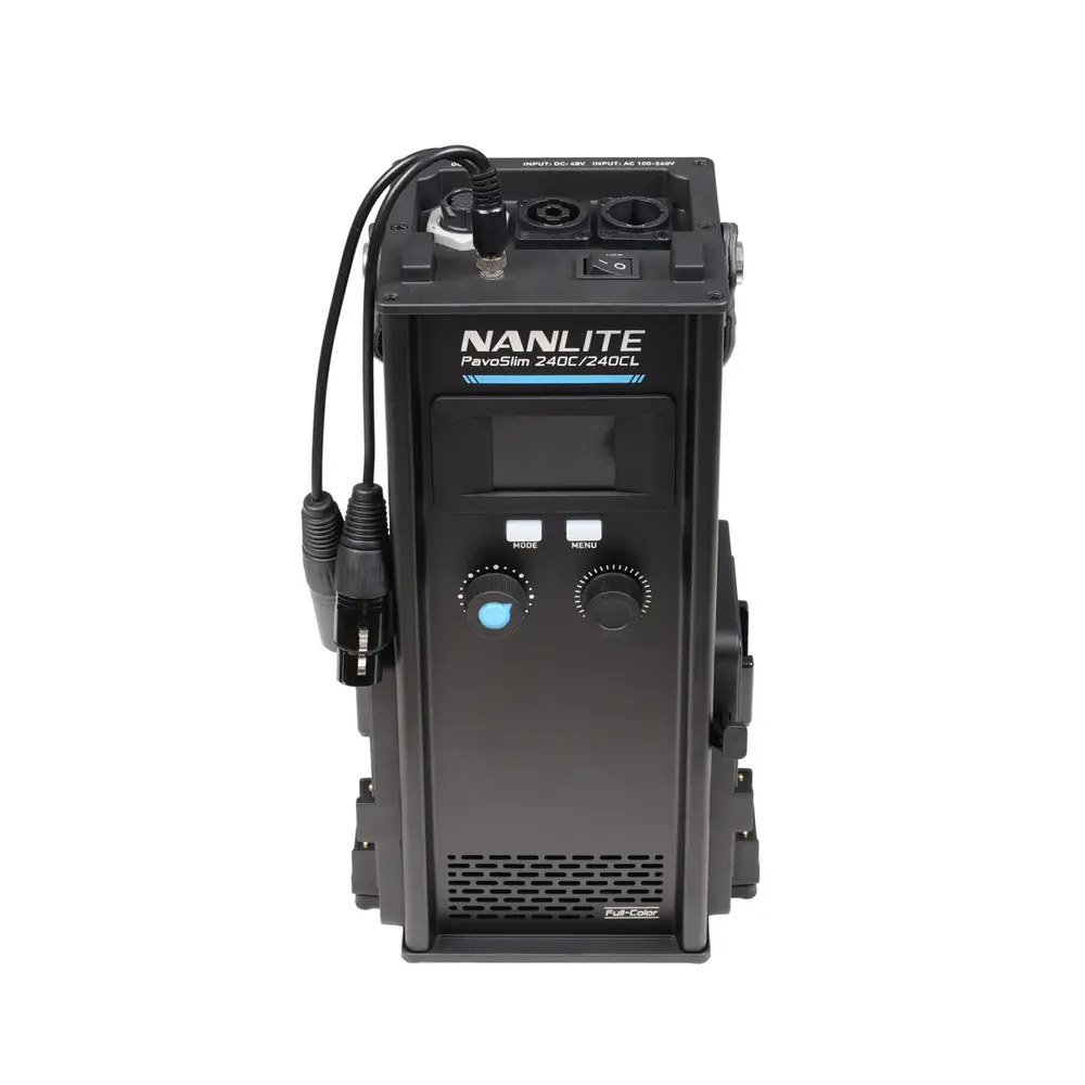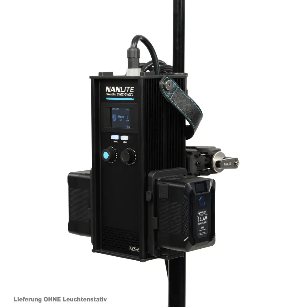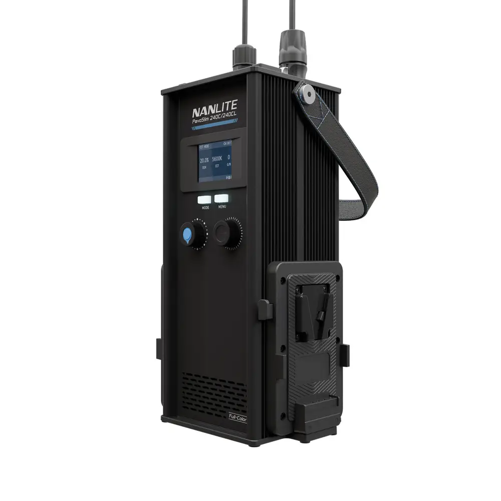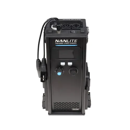 Separate Steuereinheit mit Bedienelementen und übersichtlichem 2,0“-Farb-Display sowie Anschlüssen für zwei V-Mount-Akkus, DMX/RDM-Adapterkabel, 48 V DC, usw. USB-Buchse für Firmware-Update. Tragegriff. Befestigung der Steuereinheit am Leuchtenstativ mittels mitgelieferter Stativklammer mit Schnellkupplung. 4,50 m-Netzkabel.