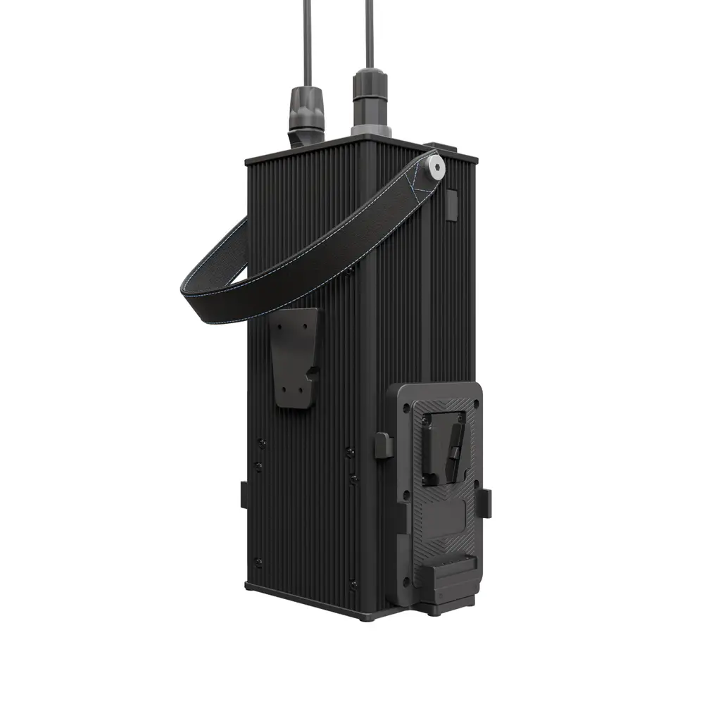 Akkubetrieb für den mobilen Einsatz mit einem oder zwei V-Mount-Akkus (14,4 – 14,8 V / 26 V, optionales Zubehör). Befestigung an der Steuereinheit.