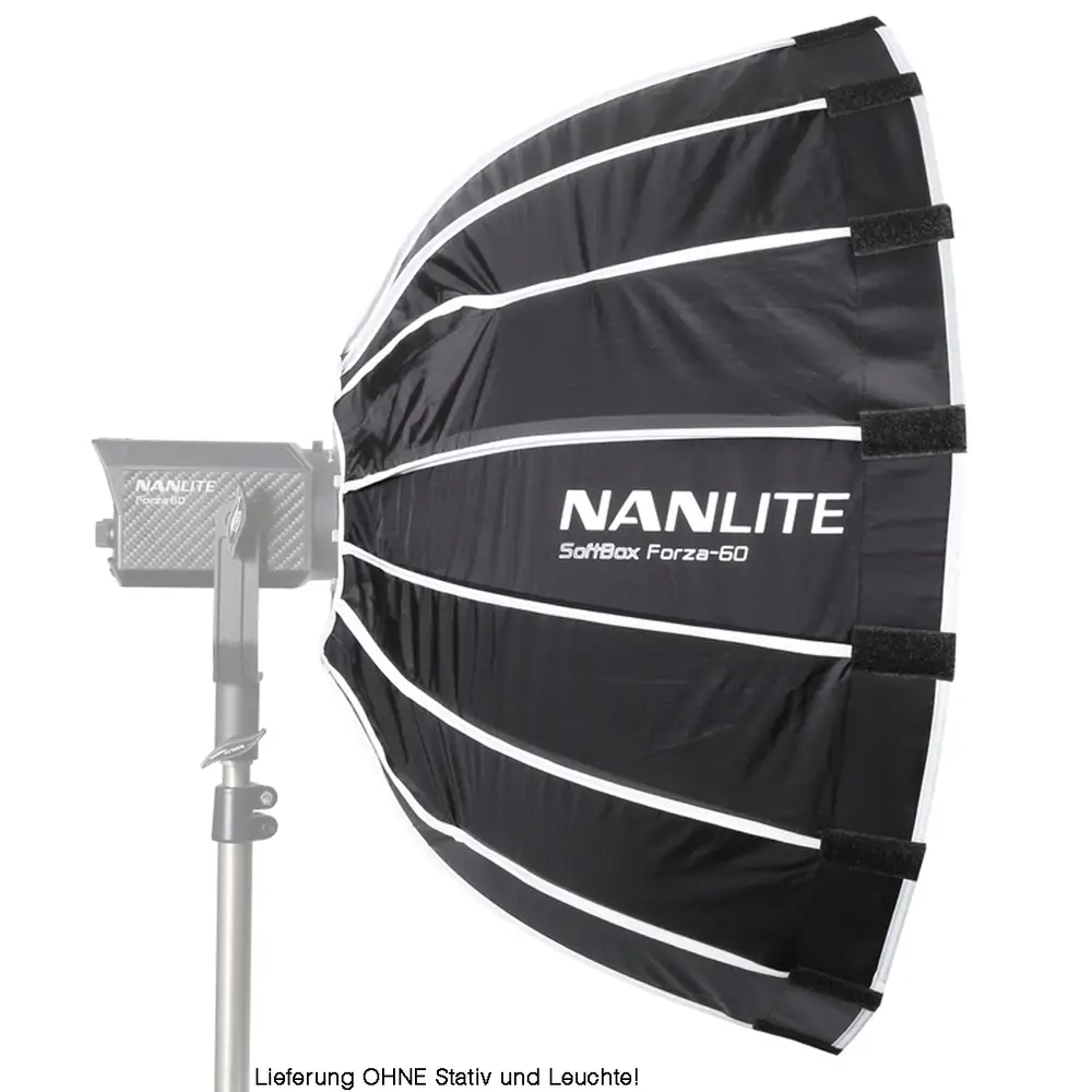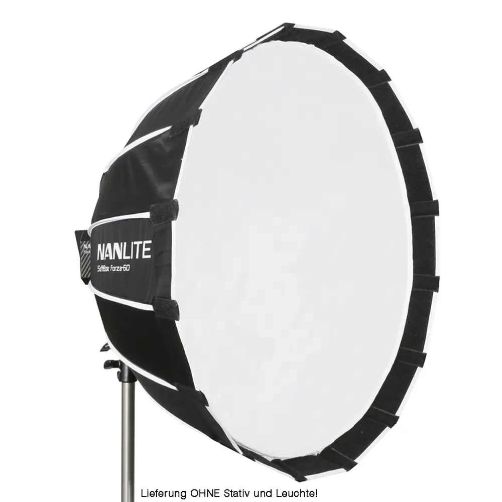 Diese hochwertige faltbare Parabol-Softbox mit einem Durchmesser von 60 cm ist ausschließlich für die LED-Studioleuchte NANLITE FORZA 60 geeignet. Die Softbox läßt sich sich per Klick-System schnell und bequem aufspannen und platzsparend wieder zusammenfalten. Die Softbox besitzt einen Adapter, der sich wie bei einem Bowens Bajonett-Verschluß an der Vorderseite der FORZA LED-Leuchte arretieren läßt. Die Softbox verfügt über eine silber reflektierende Innenbeschichtung die für eine effiziente Reflexion des Lichts sorgt. Es sind zwei unterschiedliche Front-Diffusoren mit im Lieferumfang. Ein Diffusor für weiches Licht aus weinger dickem Material, der mehr Licht durchläßt und ein Diffusor aus etwas dickerem Material, welcher super weiches Licht bereitstellt. Der jeweilige Diffusor wird mittels Klettverschluß auf der Vorderseite der Softbox befestigt.Dadurch liefert die LED-Leuchte FORZA 60 mit Softbox ideale Lichtverhältnisse bei Portrait- und Produktaufnahmen und kann auch als "Soft-Light" im Videobereich eingesetzt werden. Die Softbox ist faltbar und kann im mitgelieferten Tragebeutel einfach transportiert werden. Die Tiefe der Softbox beträgt ca. 28 cm.Lieferumfang• 1x NANLITE Parabol Softbox 60 cm für LED Studioleuchte FORZA 60• 1x NANLITE Softbox-Adapter• 2x NANLITE Front-Diffusor