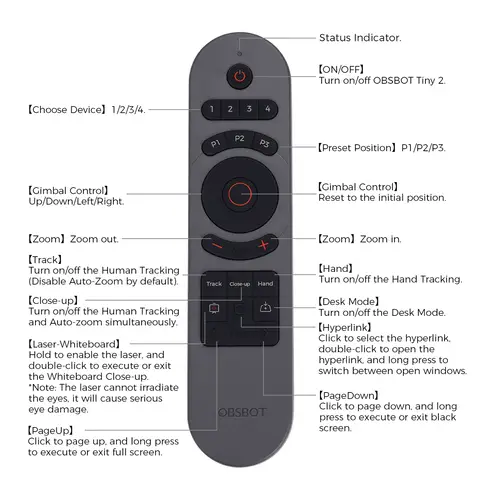 • Nicht nur zur Fernsteuerung des OBSBOT Tiny 2. Wir haben die Funktion eines Präsentationsklickers mit der Fernbedienung kombiniert, sodass Sie jetzt die Fernbedienung verwenden können, um Ihre Idee besser zu präsentieren.