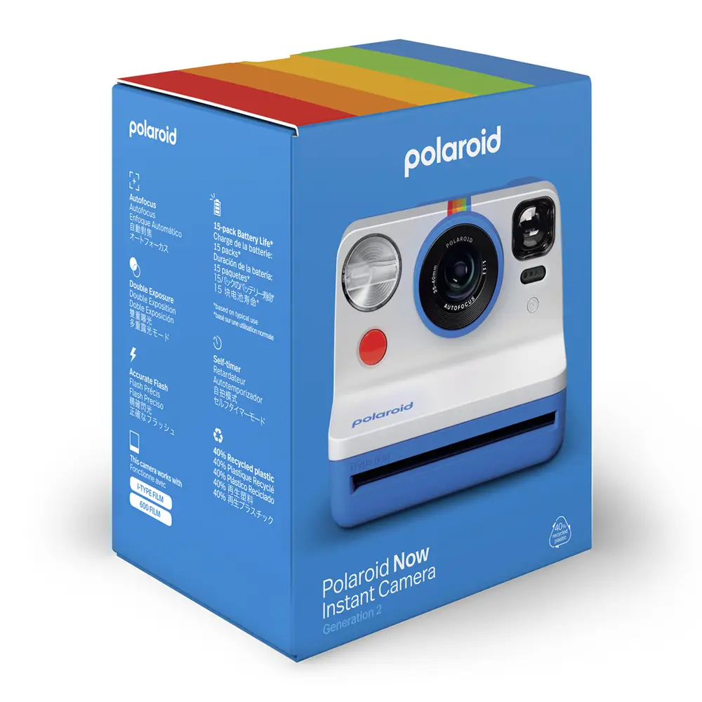 Die Polaroid Now Generation 2 Kamera ist eine klassische, analoge Sofortbildkamera mit Autofokus, Doppelbelichtung und Selbstauslöser. Sie hat ein menschenfreundliches Blitzsystem, einen internen Akku und wird mit einer Handschlaufe und einem USB-C-Ladekabel geliefert.