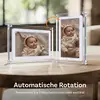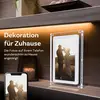 Der digitale Bilderrahmen kann entweder aufgehängt oder mit einem ausklappbaren Ständer aufgestellt werden, sowohl im Hoch- als auch im Querformat. Der Bildschirm dreht sich automatisch mit, ganz wie du es möchtest.