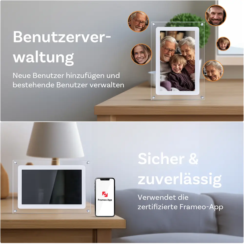 Der Bilderrahmen ist einfach einzurichten und zu bedienen, selbst für Menschen, die nicht an die Nutzung von Computern oder sozialen Medien gewöhnt sind. Stecke den Stecker in die Steckdose, schalte den Bilderrahmen ein und stelle deine Vorlieben intuitiv über den Touchscreen ein.