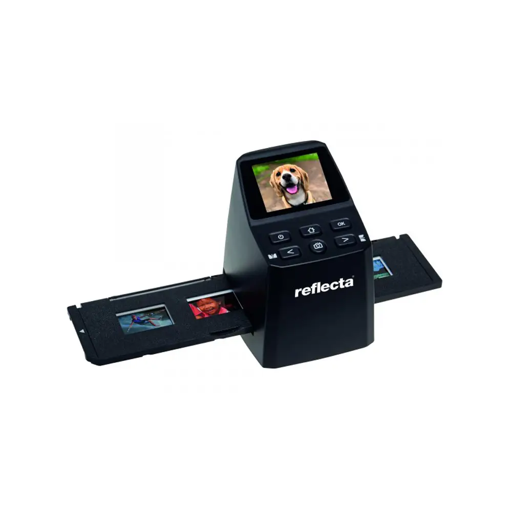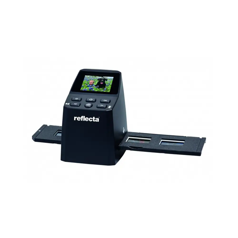 Mit dem reflecta x22-Scan lassen sich Dias und Negativstreifen auf sehr einfache und schnelle Weise in hoher Qualität digitalisieren. Der Scanner verfügt über ein 5,8-cm-Display zur Bildkontrolle und speichert die gescannten Bilder direkt als JPEG-Dateien auf einer SD-Karte. Dadurch ist er als eigenständiges Gerät völlig unabhängig von Computern. Die beiliegenden Halter ermöglichen das Scannen von gerahmten Dias mit einer Dicke von bis zu 3,2 mm und von 35mm-Filmstreifen mit bis zu sechs Bildern. Die Halter sorgen zudem für eine optimale Planlage der Vorlagen sowie für einen schonenden Umgang mit dem wertvollen Filmmaterial. Die erforderliche Zeit für jeden Scanvorgang beträgt weniger als zwei Sekunden.Produktinformationen:• Bildsensor: 1/4" - 8 Megapixel CMOS-Sensor• Auflösung: 3468 x 2312 Pixel oder 4904 x 3268 Pixel (interpoliert)• Belichtungs- und Farbkorrektur: automatisch / manuell (-2,0 EV bis +2,0 EV)• Filmtypen: Positiv (Dias), Negativ, Schwarzweiß (135, optional Typ 126)• unterstützter externer Speicher: SD/SDHC-Speicherkarten mit bis zu 128 GB• Stromversorgung: Netzteil 5V / 1A (Micro-USB)• Kompatibilität: JPEG-Format ist kompatibel mit allen digitalen Wiedergabegeräten• Gewicht: ca. 285g• Abmessungen: 92x101x120 mm (LxBxH)Lieferumfang:• Scanner x22-Scan• Netzteil• Halter für Filmstreifen 35 mm• Halter für gerahmte Dias 5x5 cm• Reinigungsbürste• USB-Kabel• Bedienungsanleitung