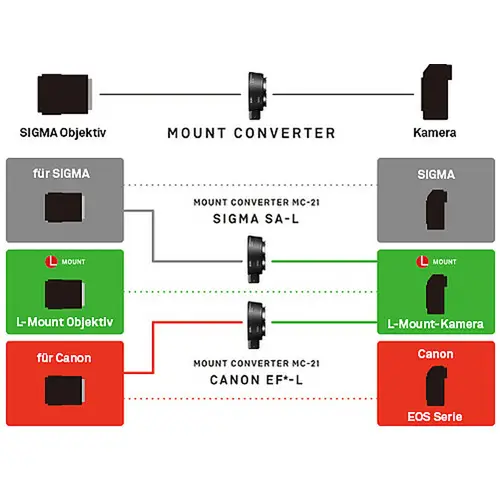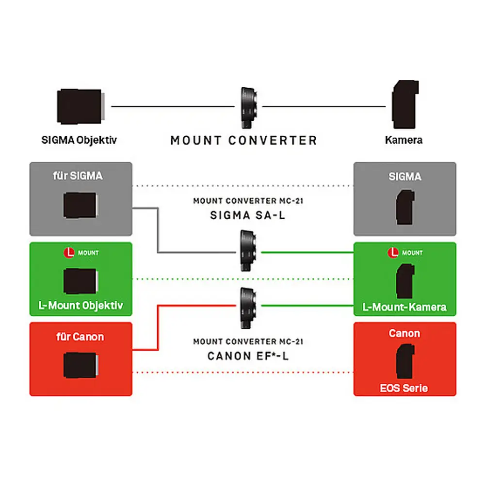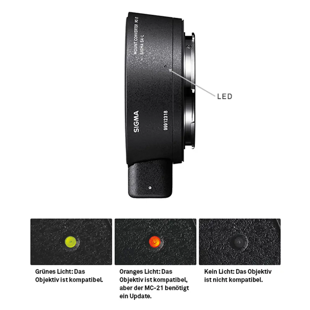 Durch den Einsatz des MC-21 an den kompatiblen (Kompatiblitätsliste anbei) SIGMA Wechselobjektiven mit SA-Anschluss oder SIGMA Wechselobjektiven mit EF-Anschluss (für Canon) können diese als L-Mount-Systemobjektive verwendet werden, um die effektive Nutzung bereits vorhandener wertvoller Objektive zu fördern.Der MC-21 erhöht die Anzahl der von SIGMA hergestellten Wechselobjektive, die mit dem L-Mount-System verwendet werden können, um 29 Objektive. Dank der Kompatibilität mit der Auto-Crop-Funktion, können die DC-Objektive, die für das APS-C-Format ausgelegt sind, auch an einem Kameragehäuse mit einem 35mm-Vollformat-Sensor eingesetzt werden.Mit dem Mount-Converter MC-21 können SIGMA Wechselobjektive mit dem eigenen SA-Anschluss (weiterer Adapter SA-L) und SIGMA Wechselobjektive mit Canon-Anschluss (EF-L) an dem L-Mount Kamerasystem (ausgenommen sind Leica L-Mount Kameras) angeschlossen werden.Schneller und präziser AutofokusIm AF-S-Modus wird ein höchstpräziser AF erzielt.* Nicht mit dem AF-C-Modus kompatibel.Anhand der LED-Anzeige und der Farbe der LED-Anzeige ist sofort ersichtlich, ob das montierte Objektiv kompatibel ist oder nicht. Ebenso zeigt das LED an, ob ein Objektivfirmware-Update verfügbar ist.Vor-Implementierte ObjektivdatenAufgrund der Verwertung der im MC-21 vor-implementierten Daten des jeweiligen Objektivs durch das spezielle Steuerprogramm wurden Autofokus und Blendensteuerung optimiert. In Bezug auf Objektive, die zukünftig veröffentlicht werden, werden die Daten für den Betrieb dieser Objektive am MC-21 im Objektiv hinterlegt. Das bedeutet, dass keine Firmware-Update für die Verwendung zukünftiger Objektive am MC-21erforderlich sein wird. Darüber hinaus unterstützt der MC-21 auch Korrektur-Funktionen der Kamera, wie Vignettierung, Farbquerfehler und Verzeichnung.Weitere Eigenschaften:• Ausgestattet mit einem Stativsockel zum Befestigen an einem Stativ. Objektive, die nicht mit einer Stativschelle ausgestattet sind, können durch Montieren des Stativs am MC-21 verwendet werden.• Die spezielle Oberfläche im Tubusinneren verhindert Reflexe: Um einer Beeinträchtigung der Objektivleistung entgegenzuwirken und Reflexionen im Inneren zu verhindern, ist die Innenfläche mit einer speziellen Oberfläche ausgestattet.• Einbindung der Exif-Daten: Informationen wie Objektivtyp, Brennweite, Blendenwert und andere Kennzeichen werden in die Exif-Daten der Bilddateien integriert.Anmerkungen:Hinweis zur Verwendung des SIGMA Mount-Converter MC-21 bei Verwendung in Kombination mit der Panasonic LUMIX S1 und Panasonic LUMIX S1R.• Nur AF-S steht als Autofokus-Modus zur Verfügung. AF-C kann nicht ausgewählt werden.• Die ''auto continuous operation'' kann bei Videoaufnahmen nicht verwendet werden.• Touch-AF kann nicht verwendet werden.• Bei Objektiven mit MO-Funktion (Manual-Override) ist der manuelle Fokusbetrieb nur nach dem Fokussieren möglich.• MF-Anzeige ist nicht verfügbar.• Die Bildstabilisierungsfunktion der Kamera und die des Objektivs können nicht gleichzeitig genutzt werden. Bitte stellen Sie sicher, nur eine der beiden zu nutzen.• Die AF-Funktionstaste und die Fokus-Preset-Taste, die an manchen Objektiven vorhanden sind, können nicht verwendet werden.