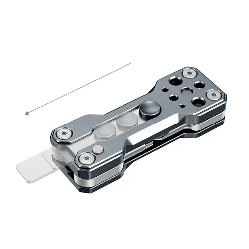 Der häufig verwendete Flachschraubendreher ist in die Seitenplatte eingebettet. Zur Verwendung, einfach herausdrücken und den Entriegelungsknopf drücken, um ihn zurück zu ziehen.