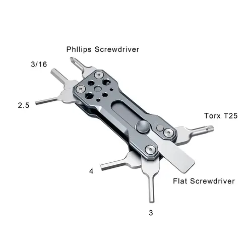 Es wird mit 4 Sechskanschlüsseln 2,5, 3, 4, 3/16, 1 Schlitzschraubendreher, 1 Kreuzschlitzschraubendreher und 1 Torx T25-Schraubendreher geliefert, die den Anforderungen der meisten Aufnahmeszenarien entsprechen.