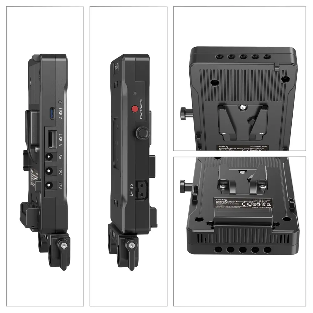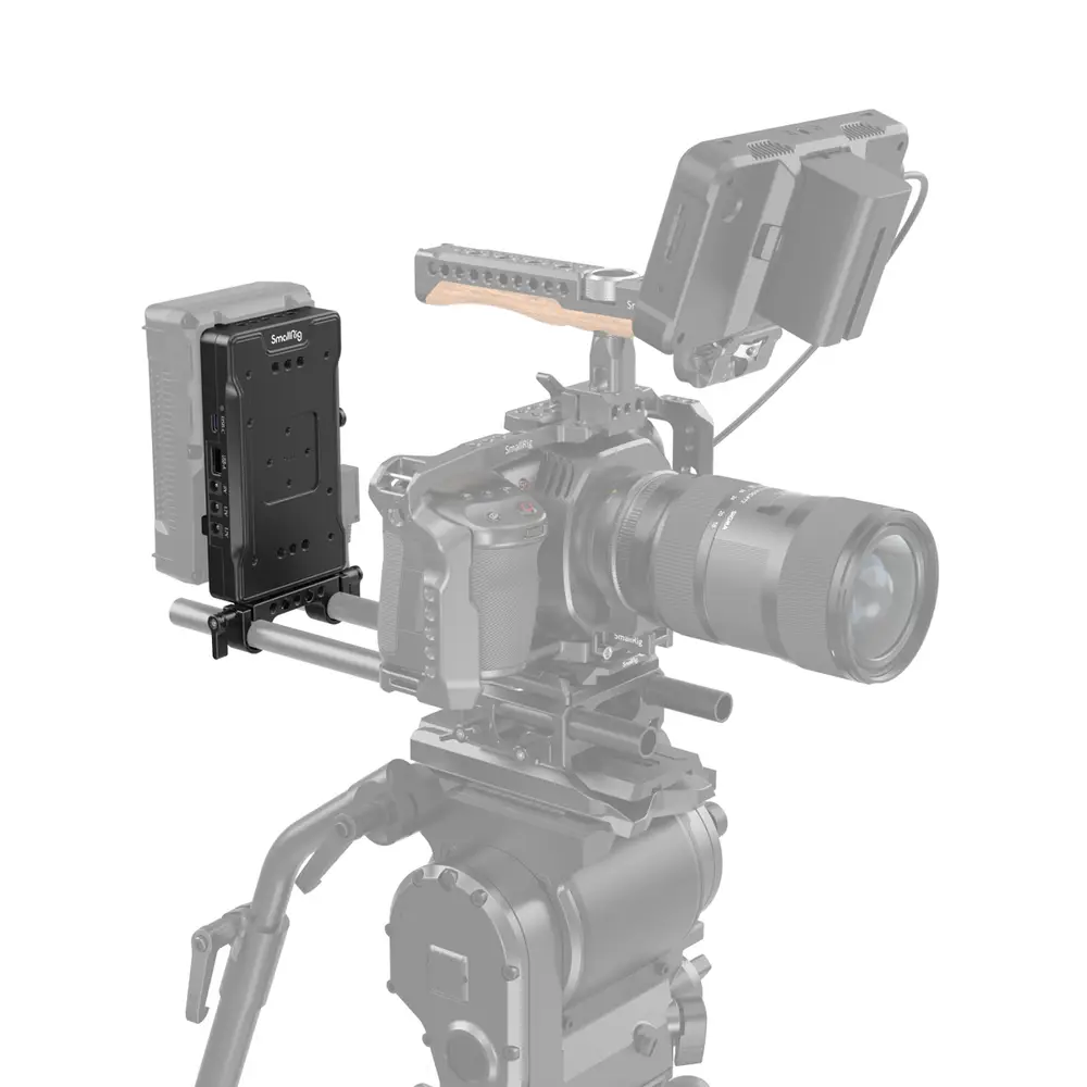Dieser Artikel verfügt über einen Standard-V-Mount, kompatibel mit den meisten V-Mount-Batterien auf dem Markt, sechs 1/4"-20-Gewindebohrungen und zehn M4-Gewindebohrungen auf der Rückseite, fünf 1/4"-20-Gewindebohrungen auf der Ober- und Unterseite, die Dual-Stabklemme und viele andere Accessoires unterstützen.