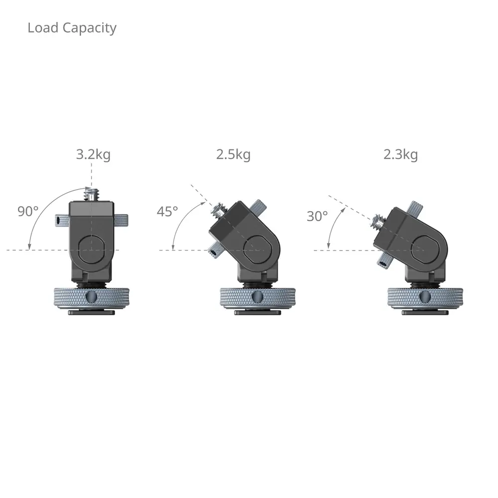 Der untere Blitzschuh verfügt über ein eingebettetes Silikonpolster und bietet vielseitige Installationsmöglichkeiten an Blitzschuhen von Kameras oder Blitzschuhhalterungen für Käfige/Griffe, um Kratzer am Gerät zu vermeiden und einen sicheren Sitz zu gewährleisten. Die obere 1/4"-20-Schraube verfügt über abnehmbare Positionierungsstifte, um bestimmte Geräte zu sichern, Abweichungen zu verhindern und Sicherheit zu gewährleisten, und ermöglicht die Befestigung von Monitoren, Mikrofonen, Lichtern und mehr. Die Halterung ermöglicht eine horizontale 360°- und vertikale 180°-Einstellung und die Regulierung der Spannung mithilfe eines Schraubenschlüssels.