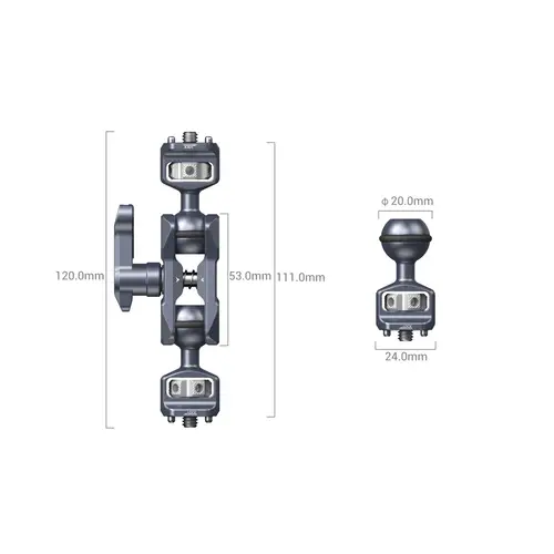 Der SmallRig Magic Arm mit zwei Kugelköpfen (1/4"-20-Schrauben) 3873 ist kompakt und leicht. Jeder Kugelkopf mit einem Durchmesser von 20 mm verfügt über eine 1/4"-20 Schraube und dehnbare Stifte, die ein Verdrehen verhindern. Der verstellbare Daumenhebel hilft, den Kugelkopf in einem geeigneten Winkel zu fixieren, und wird mit einem kleinen Magnetschlüssel an der Unterseite geliefert, um die Daumenräder festzuziehen. An beiden Enden der Kugelkopfklemme befinden sich Einkerbungen, die mehr Platz für die flexible Einstellung von Kugelköpfen und darauf montiertem Zubehör lassen. Dieser Artikel wiegt nur 88 g und ist daher leicht zu transportieren und zu verstauen.