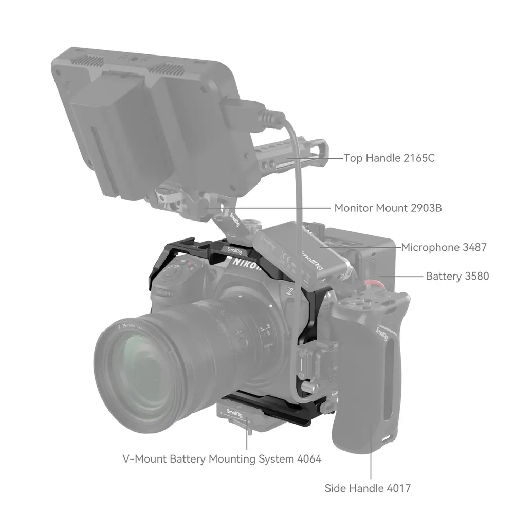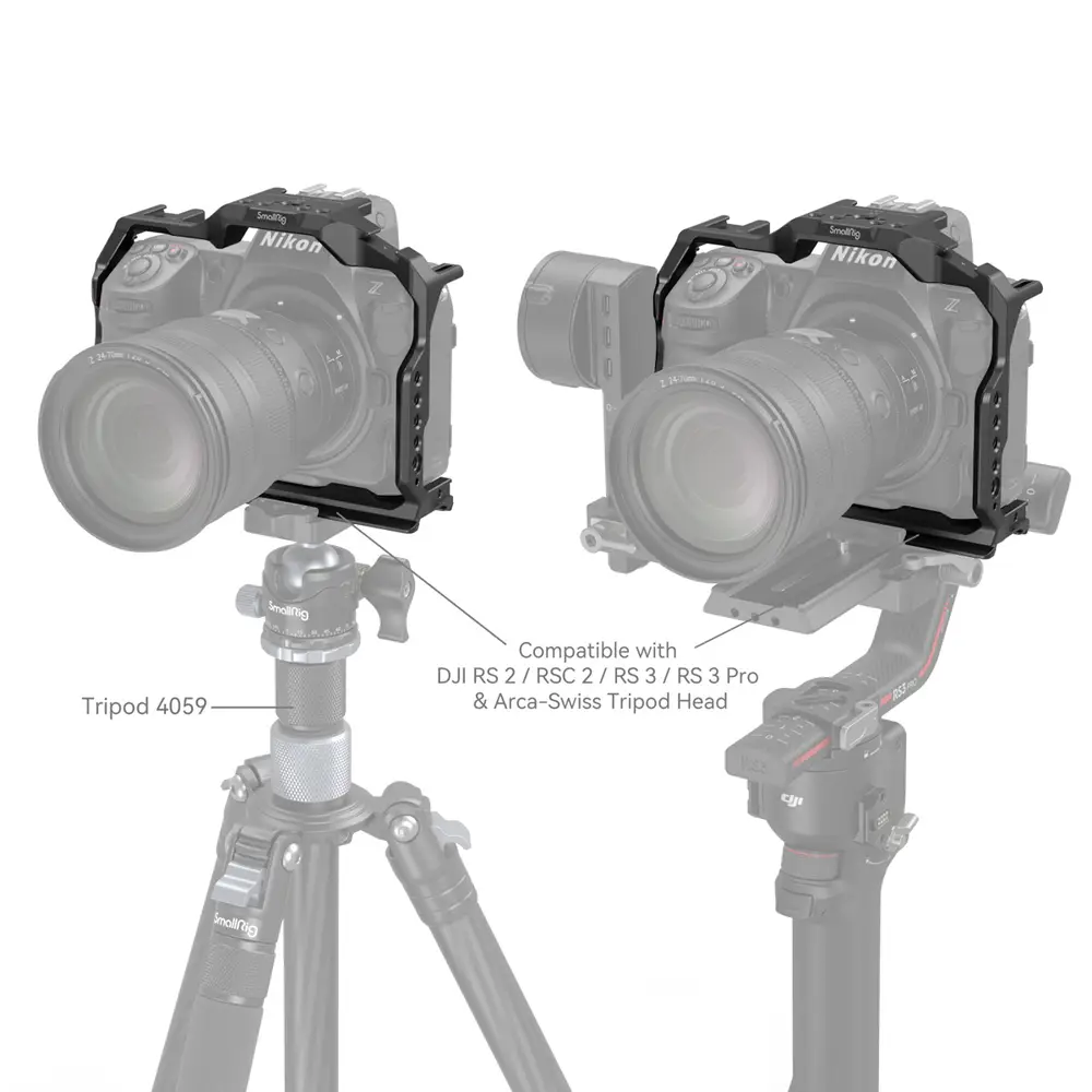 SmallRig Cage für Nikon Z 8 wurde entwickelt, um die Kamera zu schützen und Zubehör anzubringen. Die Kamera wird über eine untere 1/4"-20 Schraube, eine Befestigungsschraube und einen seitlichen Verriegelungsadapter auf der rechten Seite verriegelt. Der Cage verfügt über Gummipolster, die Kratzer verhindern, und bietet uneingeschränkten Zugang zu Tasten, Kartensteckplätzen, Flip-Screen und Batteriefach. Zu den Befestigungspunkten für das Zubehör gehören eine 1/4"-20 Gewindebohrung, eine 3/8"-16 Gewindebohrung und eine ARRI 3/8"-16 Aufnahmebohrung für den Seitenhandgriff 2093 & 3814, den oberen Handgriff 3765, die Monitorhalterung 2903 & 2904, die Manfrotto-Platte 1280 & 2458, die Halterung für portable Powerbanks 2336 und die Mini-V-Mount-Batterieplatte 2987; die 1/4"-20 Aufnahmebohrung an der Seite passt für die Einzelstabklemme 3598 und den Magic Arm 3873; und die linke NATO-Schiene verbindet schnell den Seitenhandgriff 3847 & 4017. Außerdem gibt es Halterungen für Mikrofon und LED-Videoleuchte, Gurtlöcher für die Handschlaufe 3848 und 2456 sowie QD-Halterungen für die QD-Gurtschnalle. Die untere Arca-Swiss-Schnellwechselplatte unterstützt Arca-Stative oder DJI RS 2 / RSC 2 / RS 3 / RS 3 Pro Gimbals für einen schnellen Wechsel zwischen Gimbal-, Handheld- und Stativmodus. Ein Doppelendschlüssel für die einfache Demontage und Montage ist ebenfalls enthalten.