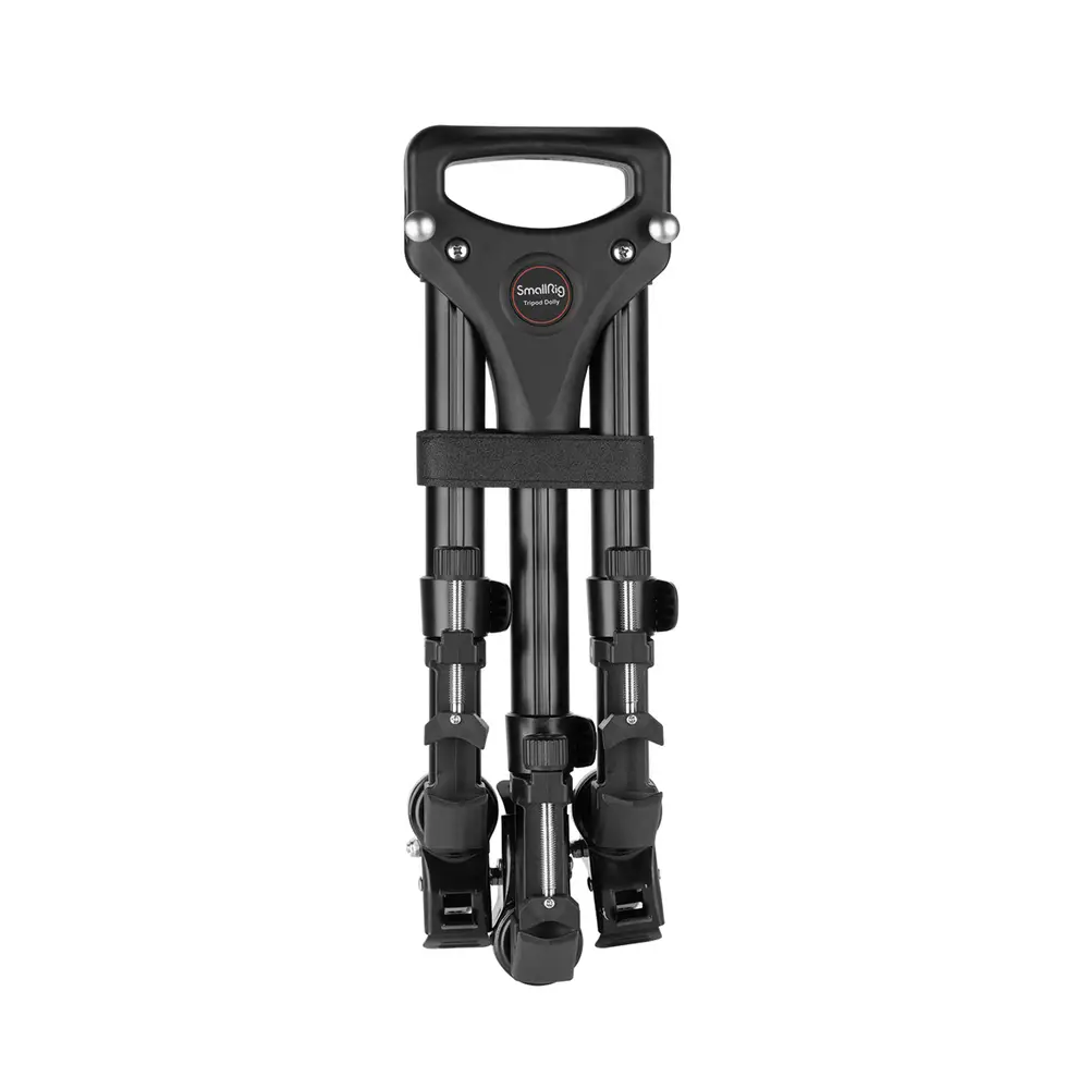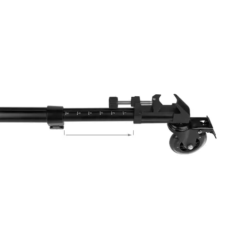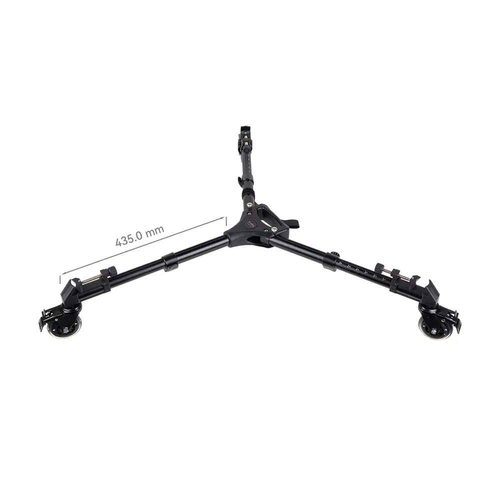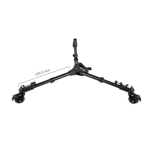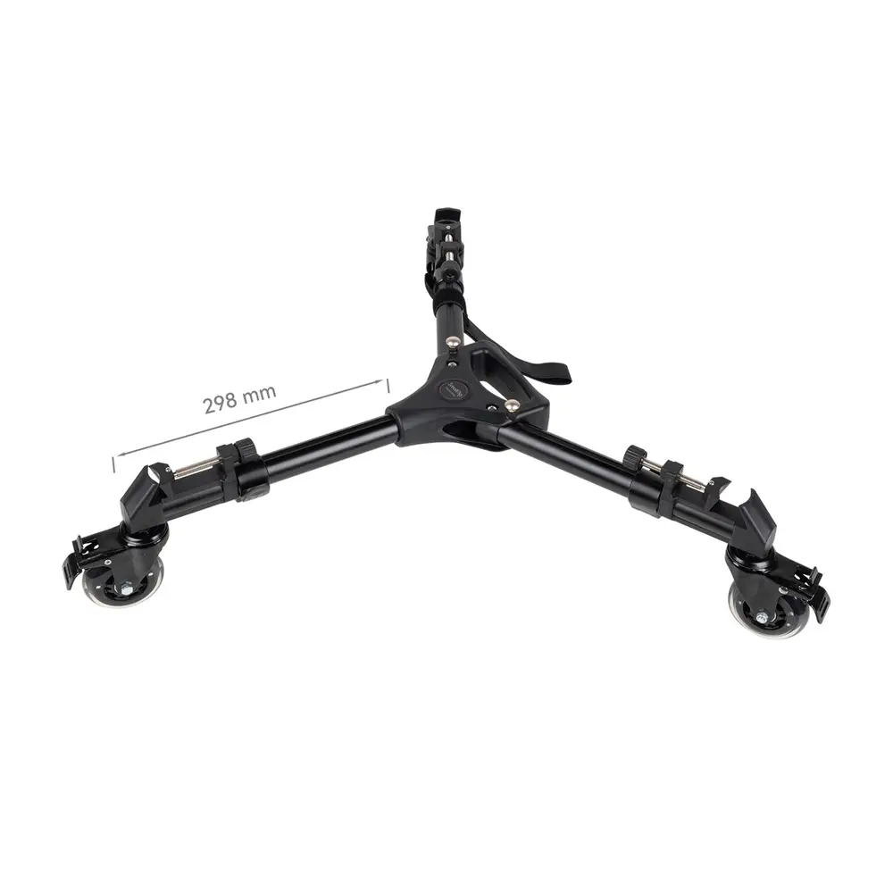 Seine großen und sehr anpassungsfähigen Räder sind für kompliziertes Gelände geeignet und verfügen über Feststellvorrichtungen, um ein Verrutschen bei Bodenunebenheiten oder Kollisionen zu verhindern. Die ausziehbaren Beine, mit einer Länge von 298 mm bis 435 mm, ermöglichen die Kompatibilität mit verschiedenen Stativen in allen Öffnungs- und Schließwinkeln. Dieses faltbare und einfach zu verstauende Tripod Dolly wird außerdem mit einem Handgriff und einer Aufbewahrungstasche für den einfachen Transport geliefert.