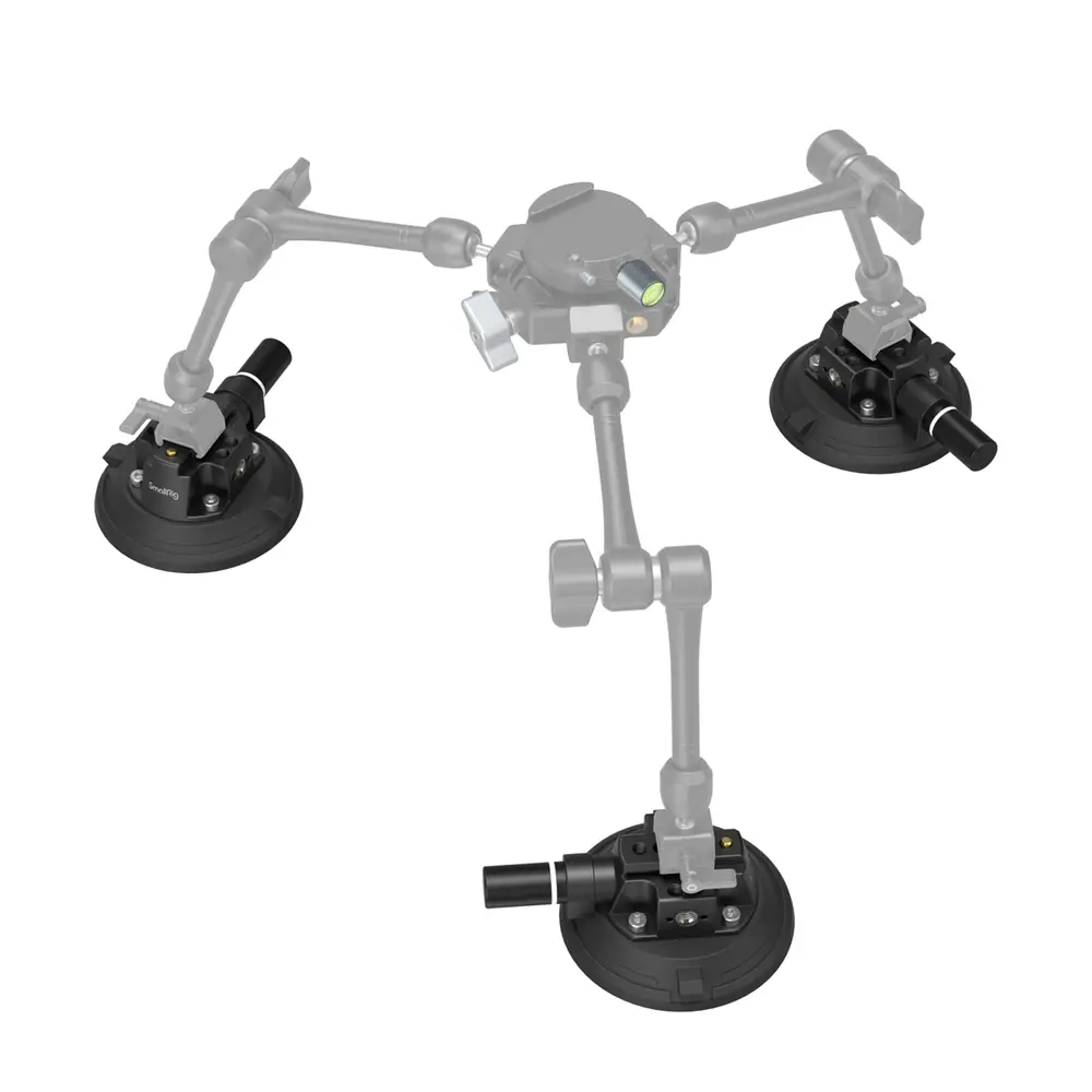 Die Saugnapfhalterung aus Aluminiumlegierung verfügt über Befestigungspunkte für Zubehör: 1/4"-20 Gewindebohrungen, 3/8"-16 Gewindebohrungen und ARRI 3/8"-16 Aufnahmebohrungen. Sie unterstützt die Befestigung von von 3757B, 3873, 3874, 3875, 2906B, 2070B, 2115C, usw. Sie wird manuell gepumpt und verriegelt und verfügt über eine Sicherheitsanzeige, um Sicherheit und Zuverlässigkeit zu gewährleisten.