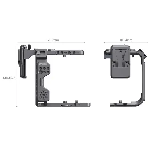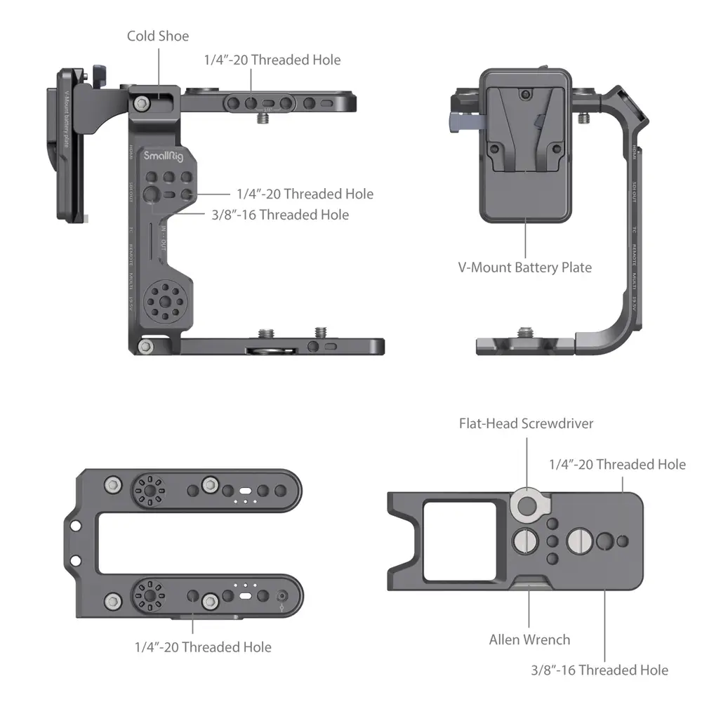 Hauptmerkmale• Leicht und kompakt• Neues Design von Aussehen und Farbe passen zu Sony FX6• Die abnehmbare Seitenplatte hilft beim Ausbalancieren der Kamera, wenn sie vertikal aufgenommen wird• V-Mount-Batterieplatte und Netzkabel für zusätzliche Stromversorgung• Eingebaute 1/4"-20 Aufnahmebohrungen (wie in der Kamera), 1/4"-20 Gewindebohrungen, 3/8"-16 Gewindebohrungen, ARRI 3/8"-16 Aufnahmebohrungen, Cold-Shoe-Halterung für Mikrofon, Bildübertragung, Monitor, usw.