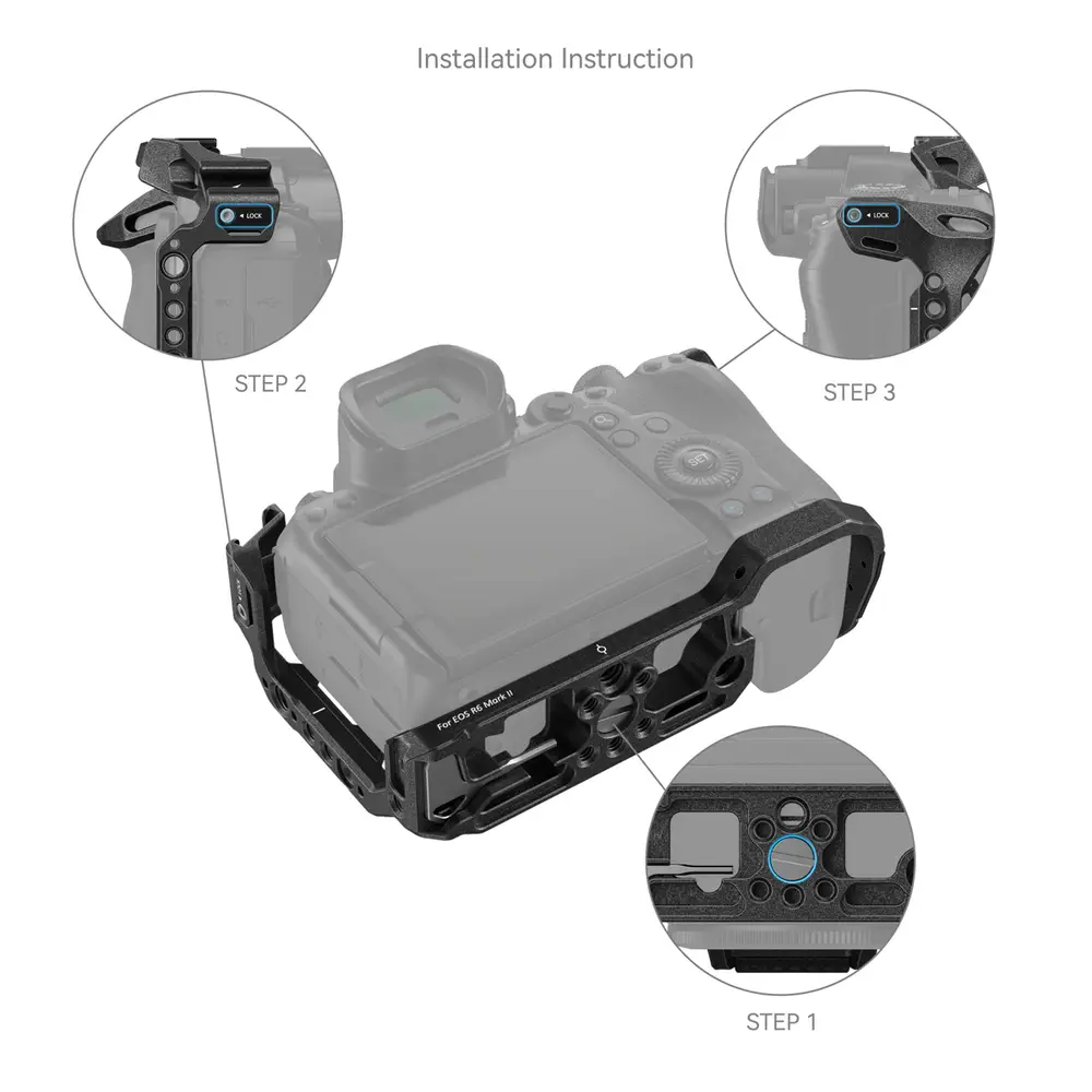 SmallRig "Black Mamba" Kameracage für Canon EOS R6 Mark II wurde zum Schutz der Kamera und zur Befestigung von Zubehör entwickelt. Es verriegelt die Canon EOS R6 Mark II über eine untere 1/4"-20 Schraube und zwei Seitenverriegelungsadapter, wobei Gummipolster Kratzer verhindern. Mit seinem "Black Mamba"-Design bietet dieser Cage vollen Zugriff auf alle Kameratasten und zahlreiche Befestigungsmöglichkeiten für Zubehör.