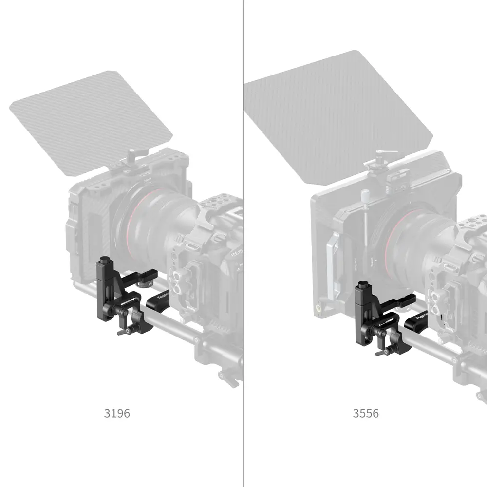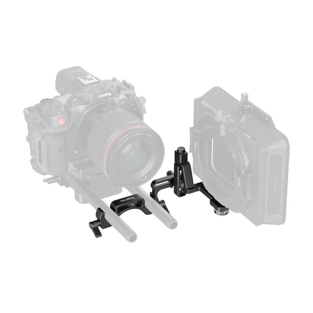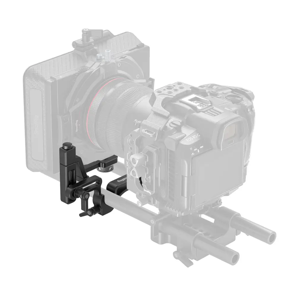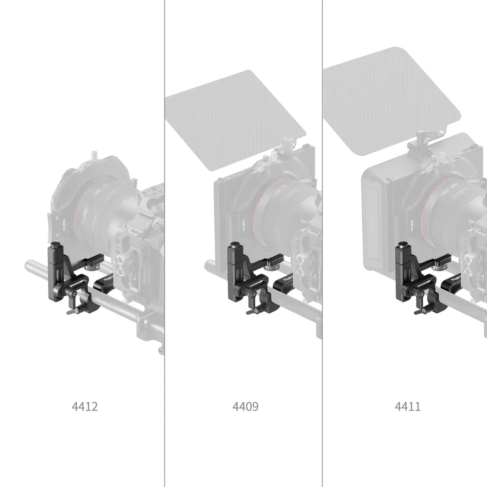 Das SmallRig 4414 Swing-Away ist eine Objektivwechselhilfe bei Matteboxverwendung. Über eine 1/4"-20-Schraube und zwei Sicherheitsstifte nimmt sie die gebräuchlichsten Matteboxen auf und kann diese per simplem Knopfdruck um 90 bis 180° aufschwingen, um genügend Raum für einen Objektivwechsel zu lassen. Zusätzlich lässt sich die Hilfe horizontal um 36 mm und vertikal um 29,9 mm verstellen. Die Swing-Away selbst wird auf zwei 15-mm-Rohre montiert.