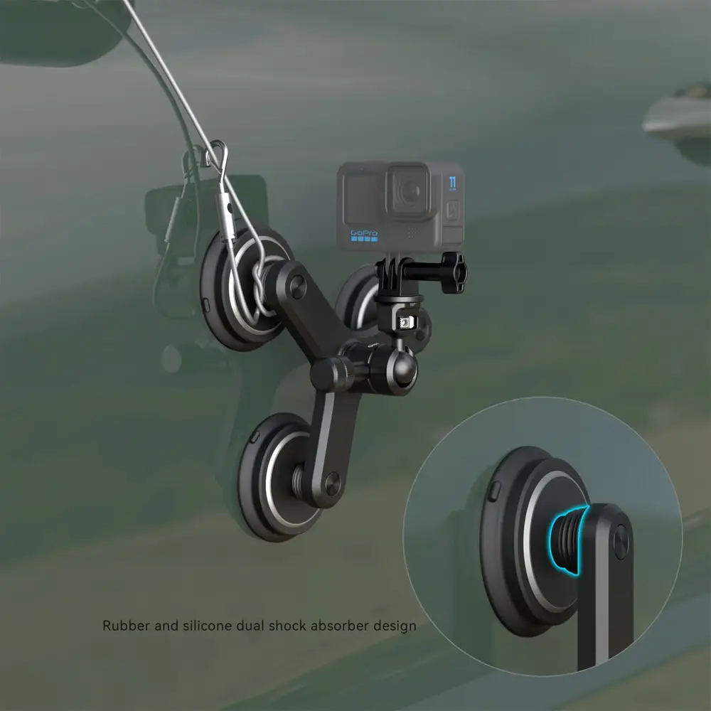SmallRig Dreifach Magnetische Saugnapfhalterung für Action-Kameras 4468, um Szenen im Auto mit einer Action-Kamera zu filmen. Es wird nur empfohlen, sie auf flachen Eisenoberflächen wie Eisentüren, Geländern, Küchenutensilien, Sportgeräten usw. zu verwenden. Das exklusive Design aus zwei Materialien kombiniert Magnete mit einem Vakuum-Saugnapf und gewährleistet somit sichereres, langlebigeres und stabileres Filmen. Selbst im unwahrscheinlichen Fall einer Leckage des Silikonsaugnapfes aufgrund starker Vibrationen können die Magnete die gesamte Halterung an der Oberfläche eines Eisenautos (mit einer Tragfähigkeit von 0,35 kg / 0,8 lbs) in einer dynamischen Aufnahmeszene auf einer ebenen Straße, wenn die Höchstgeschwindigkeit 120 km/h oder 74 mph nicht überschreitet), halten und so das Risiko des Herunterfallens aufgrund von Leckagen des Silikonsaugnapfes effektiv vermeiden. Das Kit umfasst dreifache magnetische Saugnäpfe (einen für jeden Fuß), einen Kugelkopf und eine Action-Kamera-Halterung. An einem Ende befindet sich ein 1/4"-20 Gewinde zum Anbringen einer Action-Kamera, eines Monitors, einer LED-Videoleuchte, eines Mikrofons usw., und die eingebauten Federstifte unterstützen Zubehörteile von SmallRig wie 3084C, 3083C, 4088B, 4119B und andere mit Aufnahmebohrungen, um ein Verkippen zu verhindern. Das Design mit Gummi- und Silikon-Doppelschockabsorber der dreifachen magnetischen Saugnapfhalterung reduziert Erschütterungen bei dynamischen Aufnahmen und verbessert die Bildstabilität.