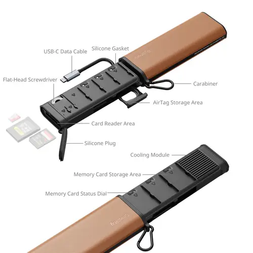 Ausgestattet mit einem integrierten USB 3.2 Gen 2-Chip liefert es Geschwindigkeiten von bis zu 10Gbps (1250MB/s), während der Aluminiumkühlkörper und der zusätzliche USB-C-Stromanschluss eine stabile Leistung gewährleisten. Der dedizierte AirTag-Steckplatz ermöglicht ein sicheres Speicherkartenmanagement.
