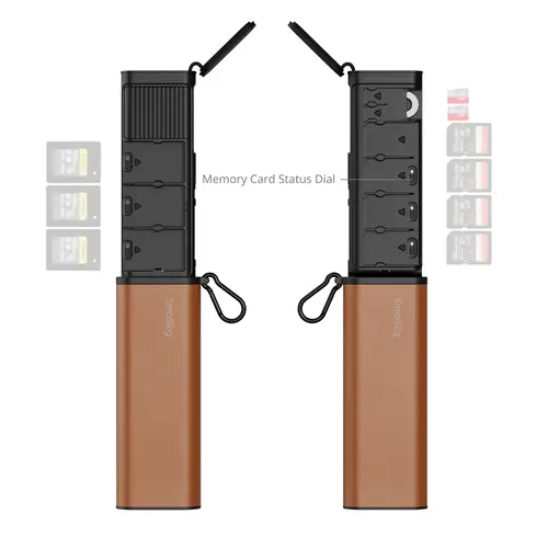 Das Gehäuse kann bis zu 9 Karten aufnehmen: 4x SD, 2x Micro SD (TF) und 3x CFexpress Typ B. Jeder Steckplatz verfügt über ein Silikonpad zur sicheren Aufbewahrung und eine Wähltaste zur Markierung des Kartenstatus (leer/voll).