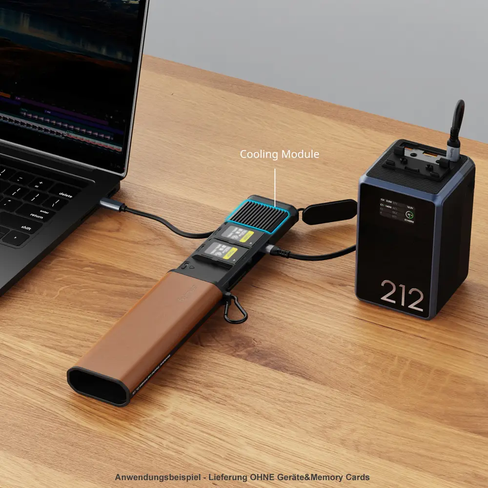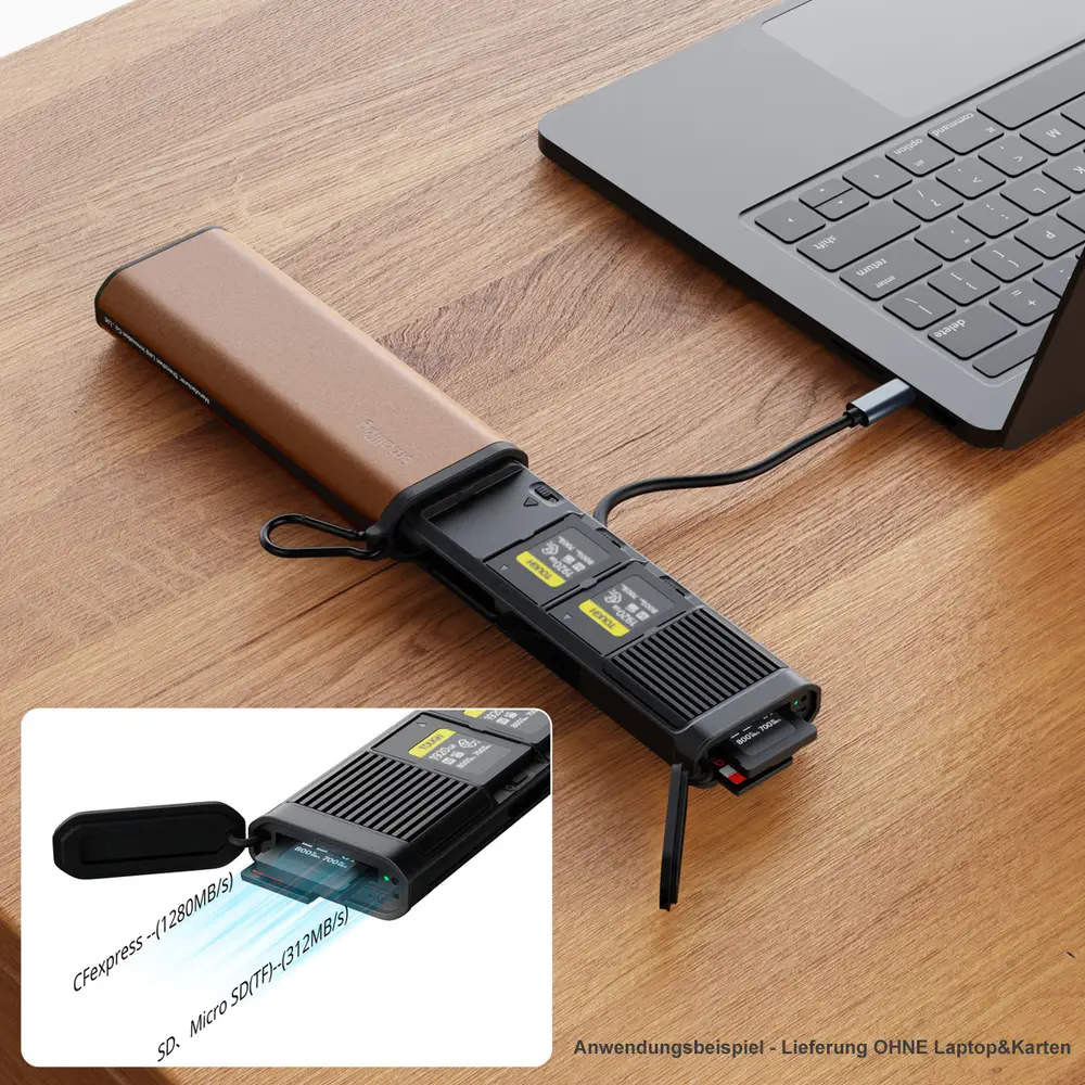 Dieses Gerät bietet eine sichere, hochkapazitive Kartenspeicherung sowie Hochgeschwindigkeits-Datenübertragungsfunktionen und unterstützt die gleichzeitige Verwendung von CFexpress Typ B, SD und Micro SD (TF) Formaten für maximale Effizienz.