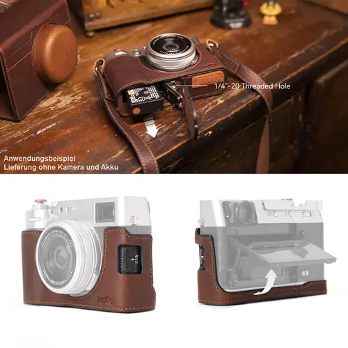 Das Kit umfasst eine Leder-Halbschale, eine Flip-Case-Hülle und einen Schultergurt. Sowohl die Außenseite der Ledertasche als auch die Flip-Case-Hülle bestehen aus atmungsaktivem und verschleißfestem Rindsleder auf der ersten Schicht und greifen die Silhouette der Kamera auf, um einen auffälligen Stil zu schaffen. Die Innenseite besteht aus weicher Mikrofaser, um Kamera und Objektiv rundum zu schützen.