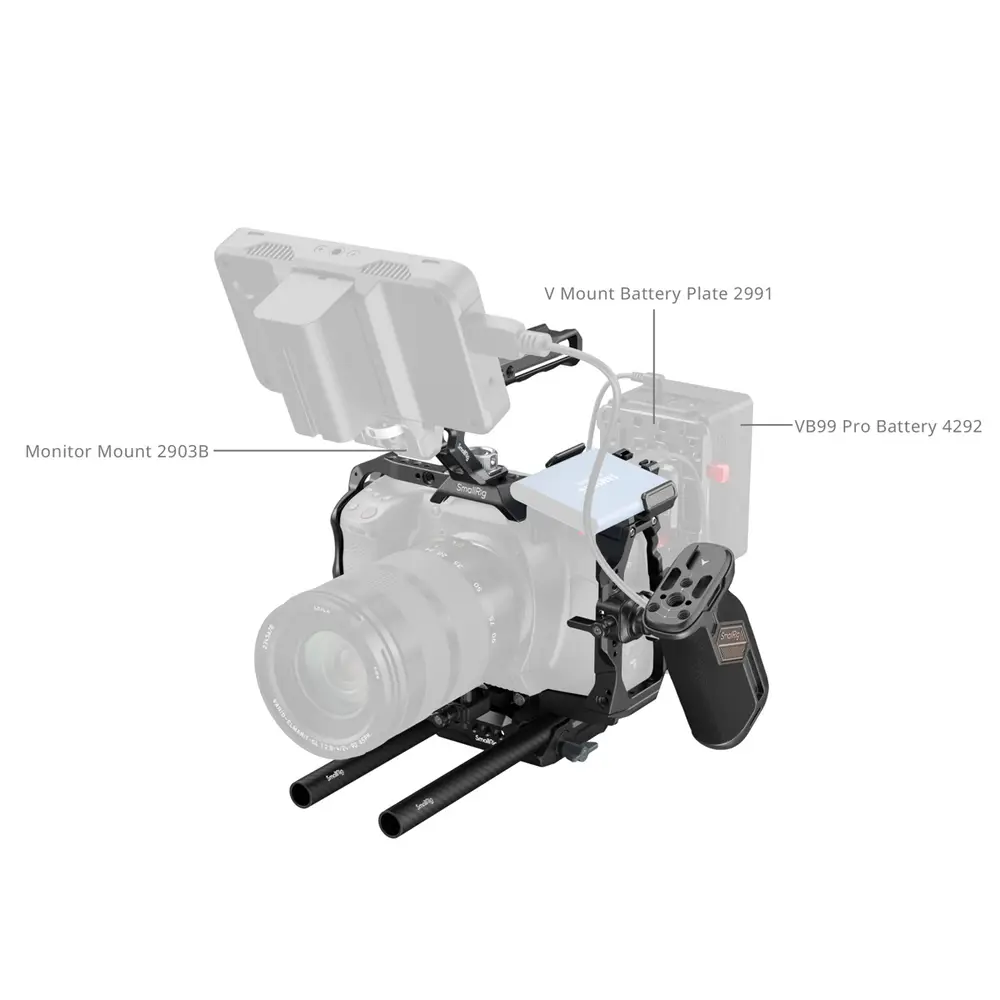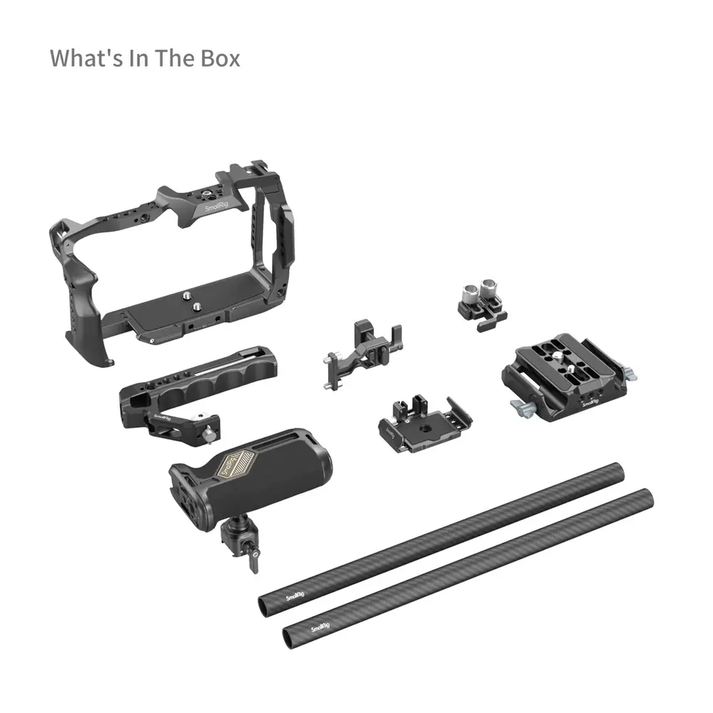 Das Kit umfasst einen Käfig, einen oberen Griff, eine HDMI- und USB-C-Kabelklemme, eine SSD-Halterung, eine Objektivadapterhalterung, zwei 15-mm-Kohlefaserstangen und eine Grundplatte. Das Dreipunkt-Verriegelungssystem sichert die Kamera mit zwei 1/4“-20 Schrauben an der Basis und einer 1/4“-20 Schraube an der Oberseite, während integrierte Silikonpads Kratzer verhindern. Der Käfig bietet ungehinderten Zugang zu allen Schnittstellen der Kamera, den Kartensteckplätzen, dem Klappbildschirm und dem Batteriefach. Die Objektivadapterhalterung ist mit Sigma MC-31, Sigma MC-21 und ähnlichen Objektivadaptern kompatibel und schützt so die Kamera vor Beschädigungen des Anschlusses. Das Kit ist außerdem mit HDMI- und USB-C-Kabelklemmen ausgestattet, um die Anschlüsse der Kamera zu schützen und Signalverluste zu vermeiden. Der ergonomische, ARRI-ähnliche obere Handgriff sorgt für eine bequeme, niedrigwinklige Aufnahmeerfahrung für Kreative und macht es einfach, die Kamera zu handhaben. Der universelle, drehbare NATO-Seitengriff ermöglicht flexible Kamerabewegungen in jedem Winkel. Die SSD-Halterung ist mit den Samsung T5/T7 SSDs kompatibel und verfügt über eine integrierte Cold-Shoe-Halterung für eine schnelle Montage und Demontage. Das Kit ist mit zwei 15-mm-Stangen und einer Grundplatte ausgestattet, die die Anbringung von Zubehör wie Mattebox (ID 3556), Follow Focus (ID 3918) und Akkuplatte (ID 2991) ermöglichen, um das Filmerlebnis oder professionelle Videoaufnahmen zu verbessern. Mit mehreren Befestigungsoptionen wie 1/4“-20-Gewindebohrungen, 3/8“-16-Gewindebohrungen, ARRI-Lochbohrungen, Cold-Shoe-Befestigungen, NATO-Schienen und QD-Befestigungen kann das Kit Zubehör wie magische Arme, seitliche Griffe, obere Griffe, Stangenklemmen, Grundplatten, LED-Videoleuchten, Mikrofone und mehr aufnehmen.