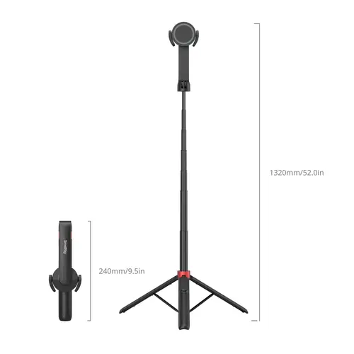 Das tragbare Selfie-Stick-Stativ ST-25Pro von SmallRig verfügt über ein vielseitiges 2-in-1-Design, das die Funktionen eines Selfie-Sticks und eines Stativs kombiniert und eine einstellbare Länge von 390 mm bis 1320 mm (15,3 Zoll bis 52,0 Zoll) bietet. Ausgestattet mit einer magnetischen MagSafe-Halterung und einer faltbaren Telefonklemme bietet der Telefonhalter Kompatibilität mit dem iPhone 12 und neueren Modellen sowie verschiedenen Android-Telefonen. Ausgestattet mit einer wiederaufladbaren Bluetooth-Fernbedienung für eine stabile Verbindung von bis zu 10 m. Der Telefonhalter bietet eine 360°-Drehung, während der Stützarm eine Winkeleinstellung von 180° ermöglicht, um eine Vielzahl von Aufnahmewinkeln zu ermöglichen. Der Stativsockel verfügt über eine Ein-Klick-Taste für eine mühelose Einrichtung. Er lässt sich bequem auf eine kompakte Größe von nur 60,0 x 68,0 x 240,0 mm (2,4 x 2,7 x 9,4 Zoll) zusammenfalten.