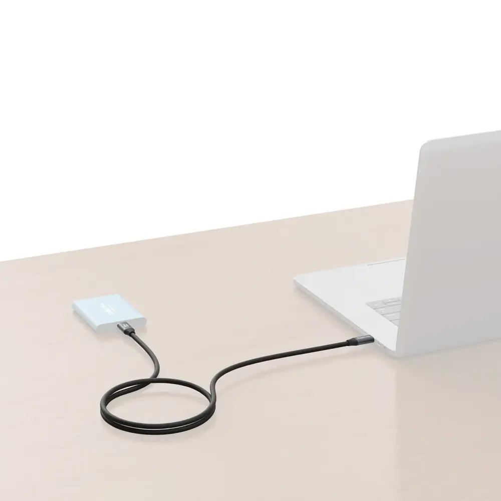 Das aus Silikon gefertigte Kabel bietet eine bequeme und flexible Haptik, während die Anschlüsse aus Aluminiumlegierung für robuste Haltbarkeit sorgen. Es verfügt über zwei USB-C-Schnittstellen mit geraden und abgewinkelten Optionen und ist mit den meisten Geräten kompatibel.