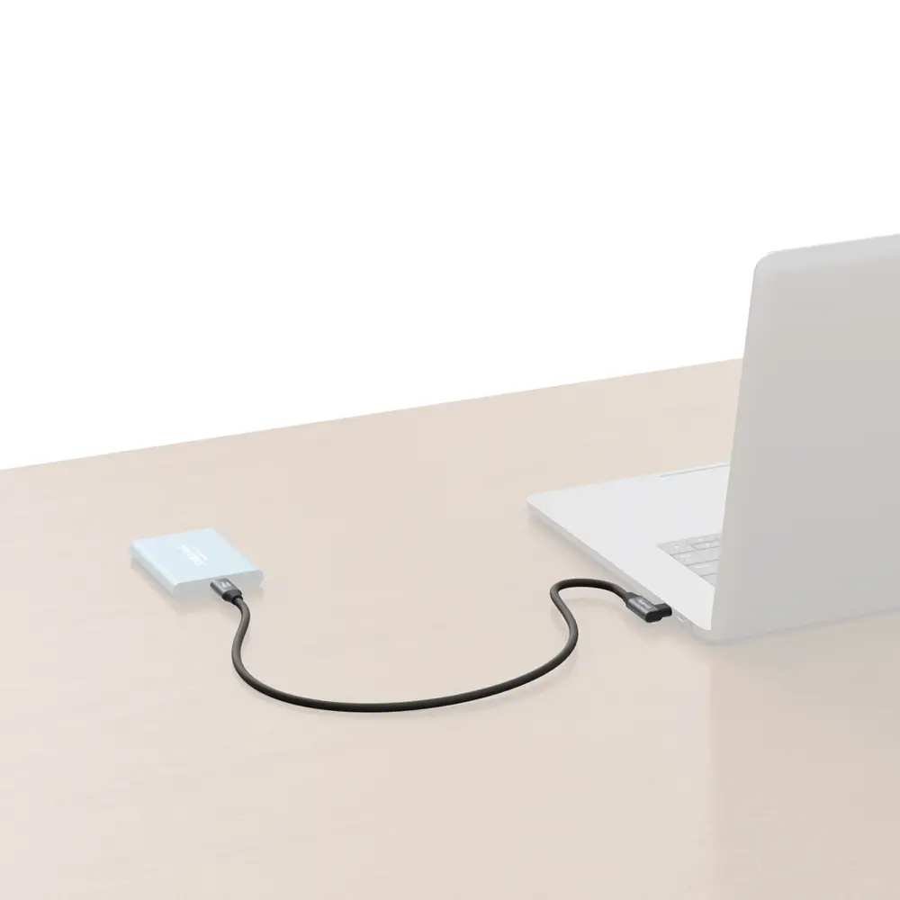 Das aus Silikon gefertigte Kabel bietet eine bequeme und flexible Haptik, während die Anschlüsse aus Aluminiumlegierung für robuste Haltbarkeit sorgen. Es verfügt über zwei USB-C-Schnittstellen mit geraden und abgewinkelten Optionen und ist mit den meisten Geräten kompatibel.