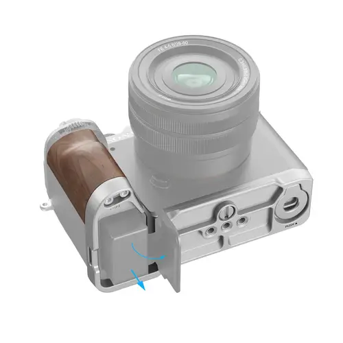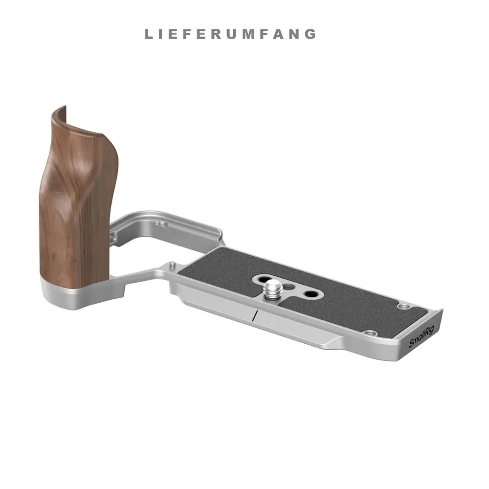 Der L-förmige Griff wird mit einer 1/4"-20-Schraube an der Unterseite an der Kamera befestigt und die integrierten Silikonpolster verhindern Kratzer. Der Handgriff besteht aus natürlichem Massivholz, ist elegant mit einem satten, natürlichen Gefühl und ergonomisch gestaltet, um das Griffgefühl zu verbessern.