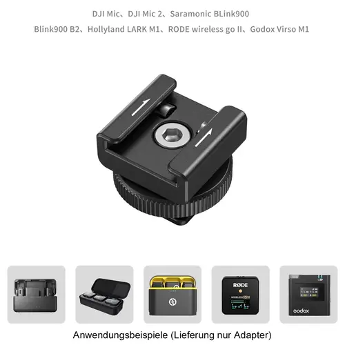 Kompatibel mit Zubehör für Blitzschuhhalterungen wie DJI Mic, DJI Mic 2, RODE Wireless GO II, Saramonic Blink900 B2, Saramonic Blink 500 B2+, Hollyland Lark Max, Hollyland LARK M1 DUO, Hollyland Lark C1, Godox Virso M1, und mehr.