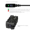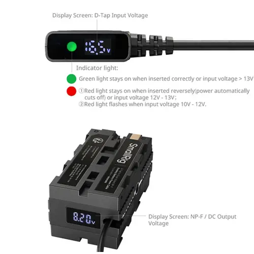 Das für Mobilität und effizientes Kabelmanagement konzipierte Stromkabel ist mit zwei Anzeigen und einem Indikator ausgestattet. Der D-Tap-Anschluss verfügt über eine Anzeige für die Eingangsspannung und eine Anzeige für die Verpolungswarnung und den Eingangsspannungsbereich, während die Blindbatterieanzeige NP-F und die DC-Eingangsspannung anzeigt.
