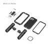 Das Set umfasst eine Handy-Schutzhülle, eine T-Mount-Objektivrückplatte, einen Objektivring, einen Käfig und einen weichen TPU-Rahmen sowie drehbare Griffe und eine kabellose Steuerung. Die Schutzhülle bietet alltäglichen Schutz und kann mit einer T-Mount-Schnellwechselplatte, einem 17-mm-Gewinde oder einem 67-mm-Filteradapter für bessere optische Leistung kombiniert werden. Der Käfig bietet zahlreiche 1/4"-20-Gewinde und Kaltlichthalterungen zur Erweiterung mit Griffen, Stativen, Mikrofonen und Leuchten. Er verfügt über eine Handgelenkschlaufe und Schultergurtlöcher für einfaches Tragen. Das hohle Design ermöglicht den Zugang zu allen iPhone-Funktionen, und der Schnellverschlussmechanismus sorgt für ein sicheres und einfaches Befestigen des Telefons. Die robuste Metallkonstruktion schützt das iPhone vor Stößen und Kratzern, während das Telefon im Käfig auch für Unterwasseraufnahmen oder bessere Kühlung verwendet werden kann. Die Griffe werden mithilfe des HawkLock H11-Schnellverschlusssystems am Käfig befestigt, wodurch sie in schnell montiert oder abgenommen werden können. Zusätzlich lassen sich die Griffe flexibel drehen, was für einen komfortablen Halt und eine mühelose Handhabung aus jeder Position sorgt. Die kabellose Fernbedienung ist abnehmbar und ermöglicht es, Aufnahmen aus der Ferne mit nur einem Knopfdruck zu steuern, bei einer Reichweite von bis zu 10 Metern.