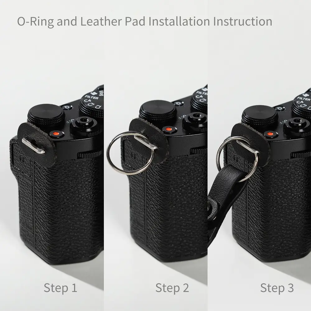 Das Leder wird einfach durch die Schlaufe des Schultergurts der Kamera geführt. Ein integriertes Schulterpolster schützt den Hals vor Reibung und erhöht die Reibung mit der Kleidung, um ein Verrutschen zu verhindern. Außerdem werden ein O-Ring und ein Polster mitgeliefert, die mit verschiedenen Kameraschultergurtschlaufen kompatibel sind.