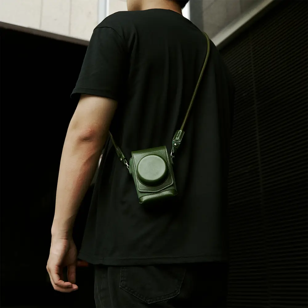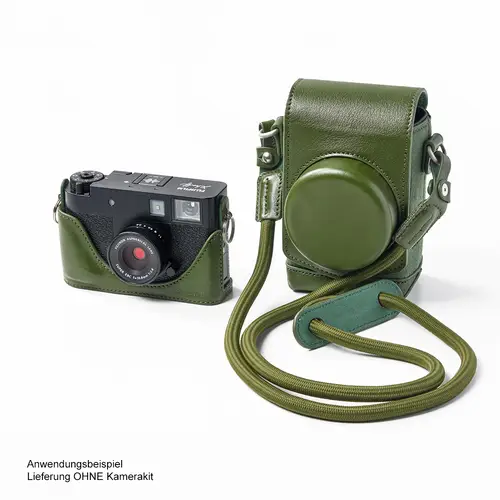 Die Full-Cover-Tasche (Grün) verfügt über ein Äußeres aus hochwertigem Echtleder und Wildleder und bietet einen unverwechselbaren Retro-Look. Das Innere ist mit weichem Plüschmaterial gefüttert, das sich der Kamera und dem Objektiv anpasst und einen Rundumschutz gewährleistet. Ein praktischer eingebauter Kartensteckplatz ermöglicht die sichere Aufbewahrung wichtiger Karten während der Reise.