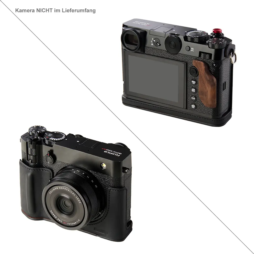 Die Ledertasche ist mit Mikrofaser-Veloursleder gefüttert und bietet einen passgenauen Sitz und Schutz vor Kratzern. Sie bietet vollen Zugriff auf alle Schnittstellen der Kamera, wie z. B. das Batteriefach, den Fokussierring und das Kartenfach.