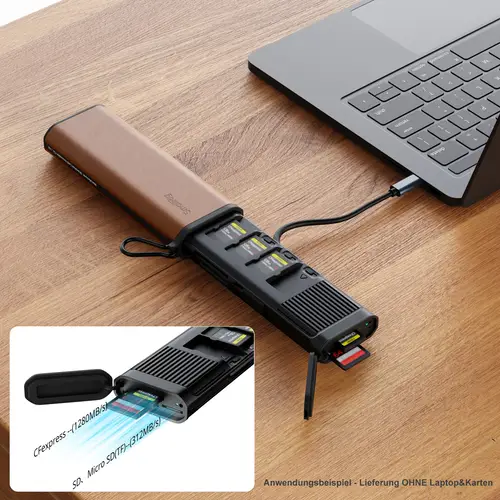 Dieses Gerät bietet eine sichere, hochkapazitive Kartenspeicherung sowie Hochgeschwindigkeits-Datenübertragungsfunktionen und unterstützt die gleichzeitige Verwendung von CFexpress Typ A, SD und Micro SD (TF) Formaten für maximale Effizienz.