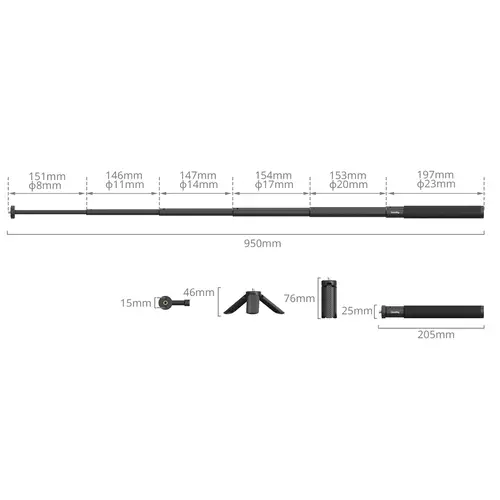 Der Stick im Taschenformat ist bis zu 95 cm ausziehbar und lässt sich auf nur 20 cm zusammenklappen. Außerdem wird er mit zahlreichem Zubehör zur Unterstützung von Smartphones und Action-Kameras geliefert, z. B. GoPro HERO13 Black, insta360 X5, DJI Action 5 Pro und AKASO. Insbesondere bei der Verwendung von Insta360 X4 können Sie den Stick von Ihren Fotos und Videos entfernen. Unter den Zubehörteilen hilft die Handgelenkschlaufe, den Stick und die Kamera sicher am Handgelenk zu halten, um die Sicherheit zu gewährleisten; das Stativ, das eine 1/4"-20 Schraube auf der Oberseite hat, befestigt diesen Stick über seine untere 1/4"-20 Gewindebohrung, um Gruppenfotos, feste Aufnahmen, etc. zu machen.
