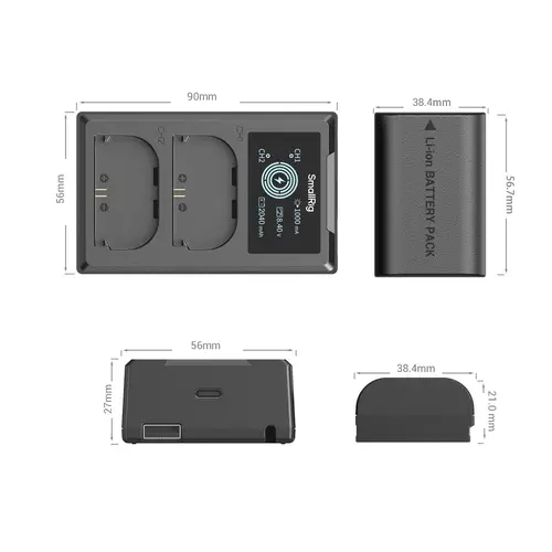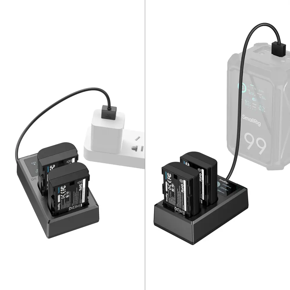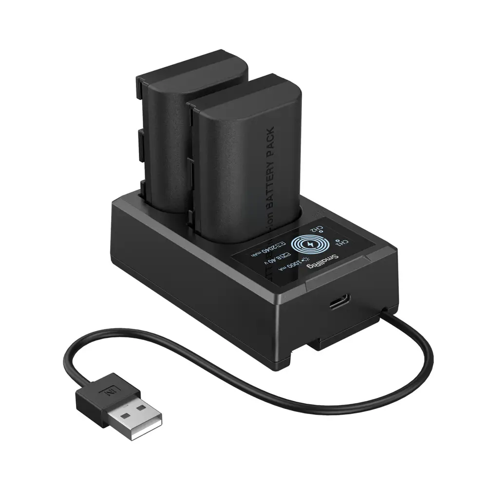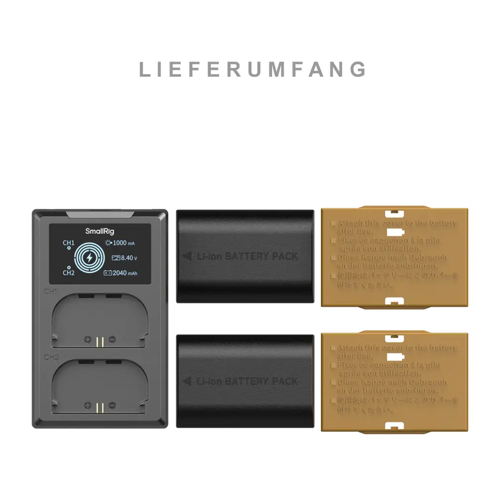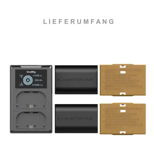 Jeder Akku liefert eine Nennleistung von 2520 mAh und bietet damit eine längere Aufnahmezeit für anspruchsvolle Arbeitsabläufe. Das Ladegerät ist mit zwei unabhängigen Steckplätzen ausgestattet, die das gleichzeitige Laden von zwei Akkus oder eines einzelnen Akkus ermöglichen und so die Effizienz bei Konfigurationen mit mehreren Akkus optimieren.