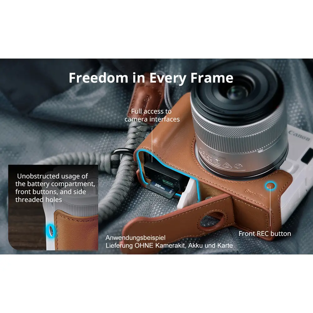 Alle Kameraanschlüsse bleiben voll zugänglich, einschließlich der REC-Taste auf der Vorderseite, des seitlichen Gewindelochs für die vertikale Montage, des Batteriefachs und des Speicherkartensteckplatzes.