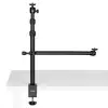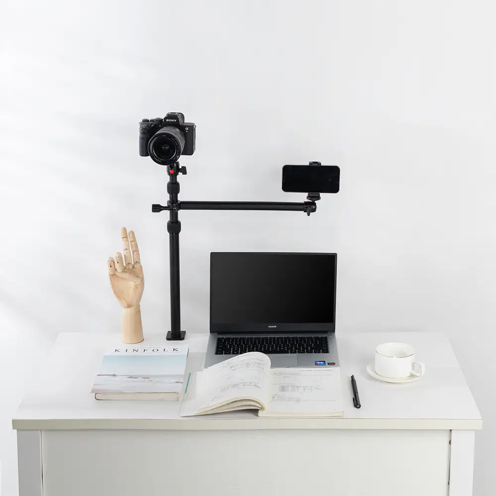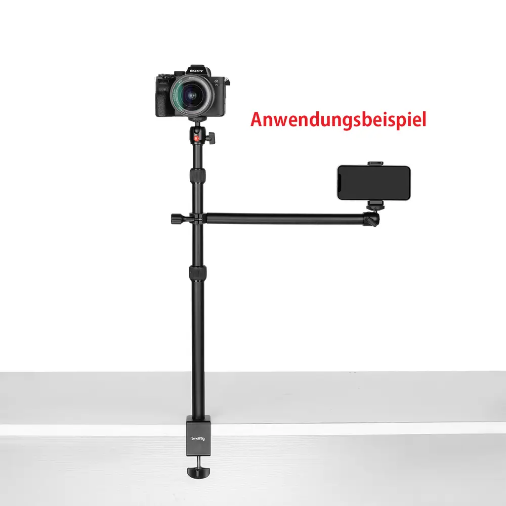 Der rostfreie Ständer besteht aus einer stabilen, langlebigen Aluminiumlegierung und verfügt über eine leicht zu reinigende, mattierte Oberfläche, die Fingerabdrücke verhindert. Ausgestattet mit 3 Verlängerungsstangen, die die Arbeitshöhe auf bis zu 1 m erweitern können. Die Halterung ist eloxiert und CNC-gefräst und wird mit einem um 360° drehbaren, abnehmbaren Kugelkopf (Φ22mm) geliefert und trägt eine Last von 3-10KG. Die 1/4"-Schraube an der Oberseite ermöglicht 360°-Schwenkungen für Panoramaaufnahmen und -90°/+45°-Neigungen für Mehrwinkelaufnahmen, ohne dass die Geräte zerlegt werden müssen. Diese Halterung passt auf bis zu 5 cm dicke Tische und ist damit platzsparender als ein Lichtstativ. Der 355 mm lange Haltearm aus Aluminiumlegierung mit einer Tragfähigkeit von 2 kg verfügt über einen Φ18-mm-Kugelkopf und eine 1/4"-Schraube an der Oberseite zur Befestigung von LED-Licht, Mikrofon, Smartphone usw.; der beigefügte Ringlichtadapter eignet sich perfekt für DSLR-Kamera, Smartphone, Ringlicht, Panel-Licht usw.