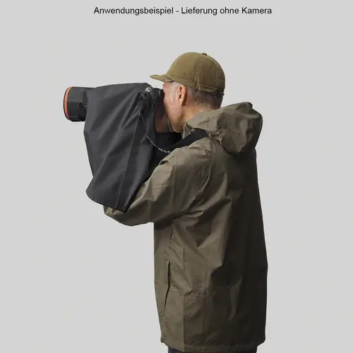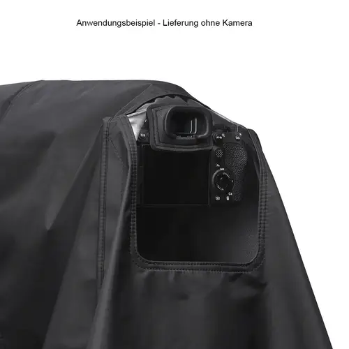 Der Wetterschutz ist für raue Bedingungen ausgelegt und schützt Kamera und Objektiv bei Aufnahmen im Regen oder Schnee. Die Hülle besteht aus einem atmungsaktivem Material, weshalb sich auch bei langen Aufnahmen keine Feuchtigkeit bildet