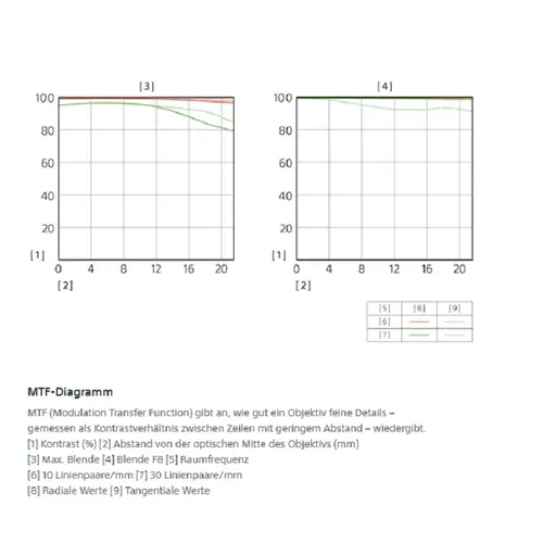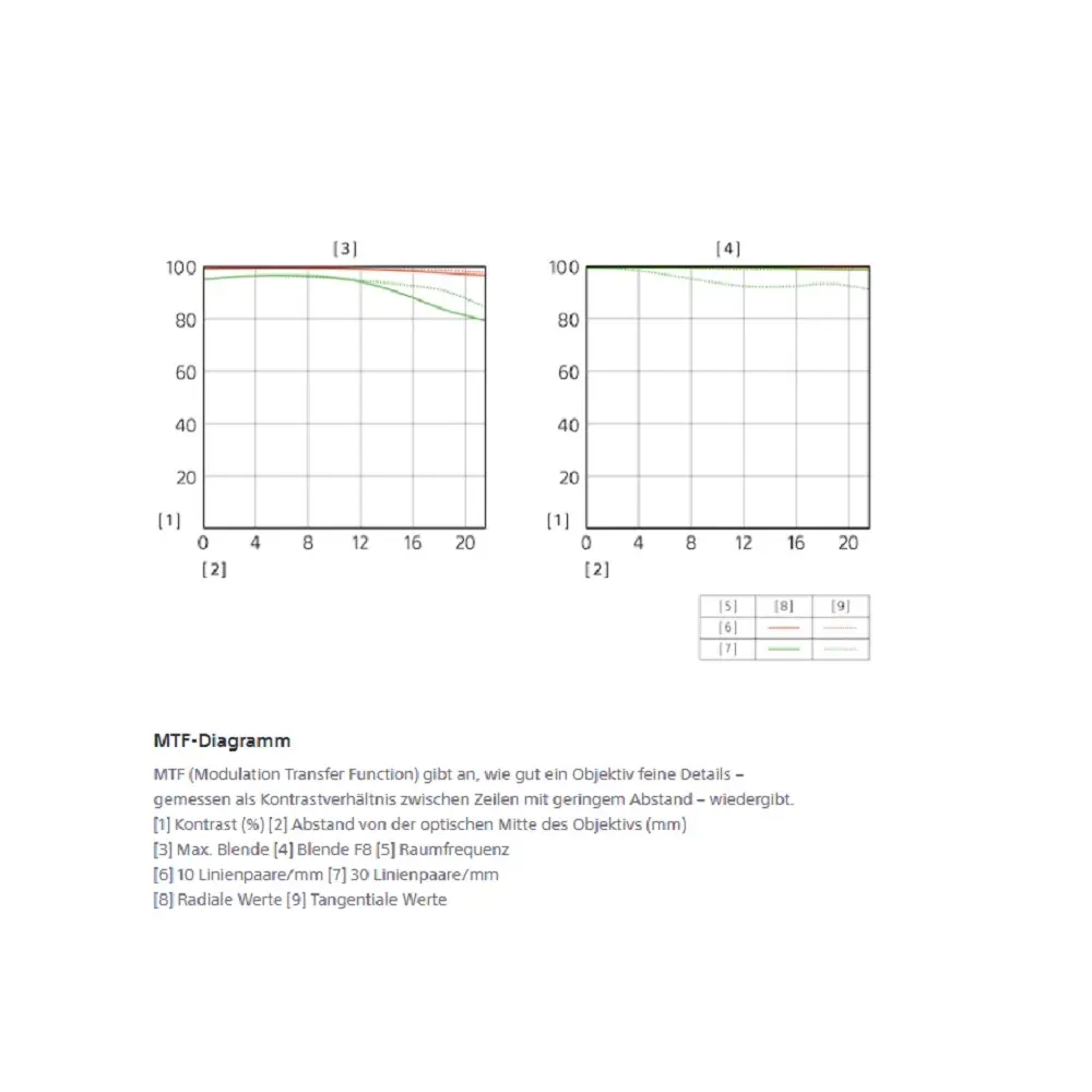 Die moderne optische Konstruktion mit Elementen aus XA-Glas (extrem asphärisch), Super-ED-Glas (Extra-low Dispersion) und ED-Glas in Präzisionsanordnung korrigiert erfolgreich Abweichungen. Das System für flottierende Fokussierung sorgt zusammen mit dieser Korrektur für die höchstmögliche Auflösung über den gesamten Fokusbereich des Objektivs bis an den Bildrand.