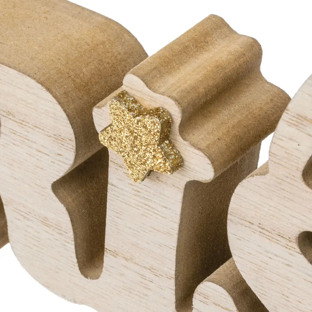 EIGENSCHAFTENKategorie: WeihnachtsdekorationFarbe: Naturholz/GoldglitterBesonderheit: Holzreliefschriftzug mit GlitzerdekorVerpackung: Schachtel