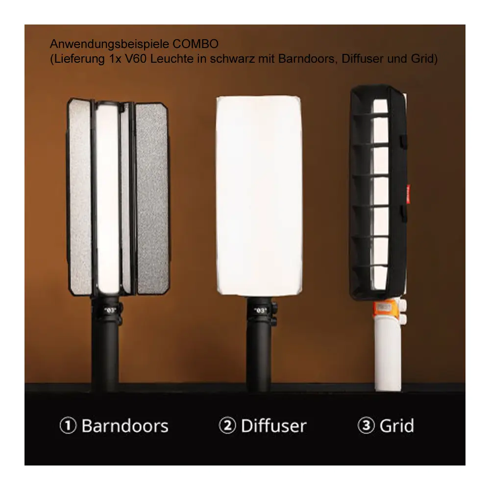 Lieferumfang:1x LED Leuchte1x USB-C Kabel1x Aufbewahrungskoffer1x Tasche für Netzteil1x Netzteil1x Abschirmklappen1x Diffusor1x Grid
