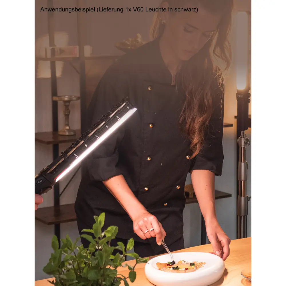 Hauptmerkmale:• LED-Lichtstab inkl. Display mit Helligkeit- und Farbtemperaturanzeige• 60 W High Power• 100 W max. mit DC & PD• Farbtemperaturbereich von 2.700 K - 6.500 K• DynaVort Kühlsystem• Inkl. Lichteffekte wie SOS, Blitz oder Feuer• Musikmodus für passendes Licht entsprechend zum Musikrhythmus