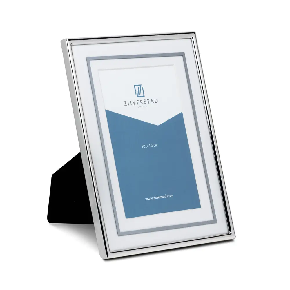 Portrait-/Tischrahmen versilbert und anlaufgeschützt, dünne, glänzende Leiste mit Silberrand im Glas und weißem Passepartout, Klarglas und Velourrückwand, zum Hängen und Stellen.